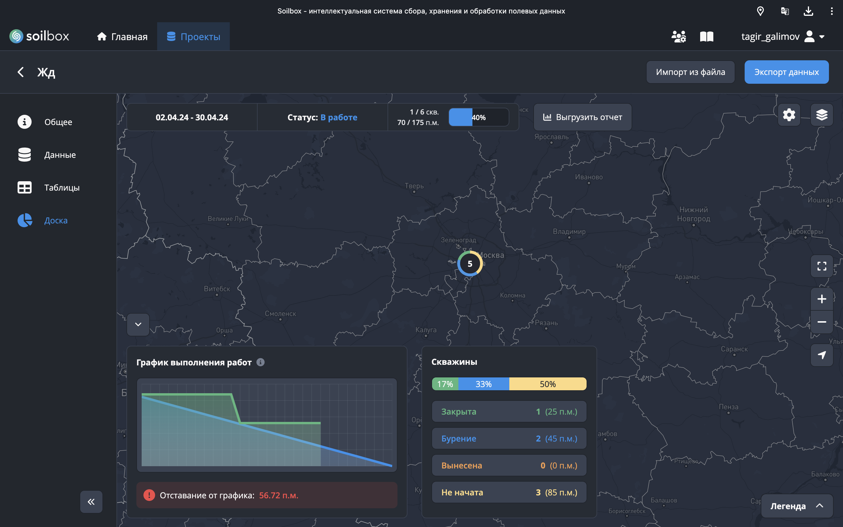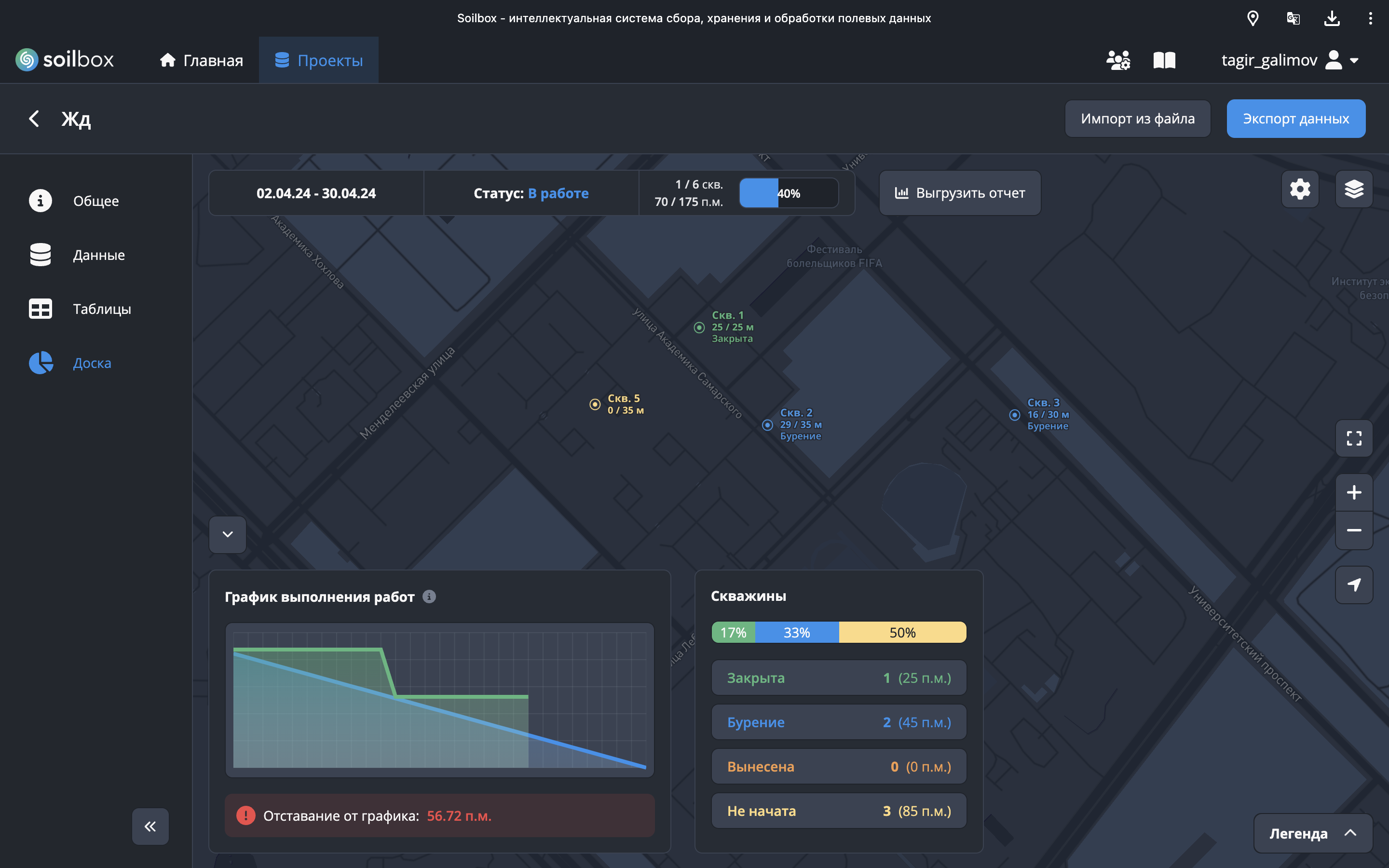 - Чтобы перейти к модулю “Доска”, на странице проекта нажмите на соответствующую вкладку в левой части экрана. Инструмент включает в себя карту с отмеченными на ней скважинами, график выполнения работ, статистику по скважинам, базовую информацию по проекту (даты работ, статус проекта).