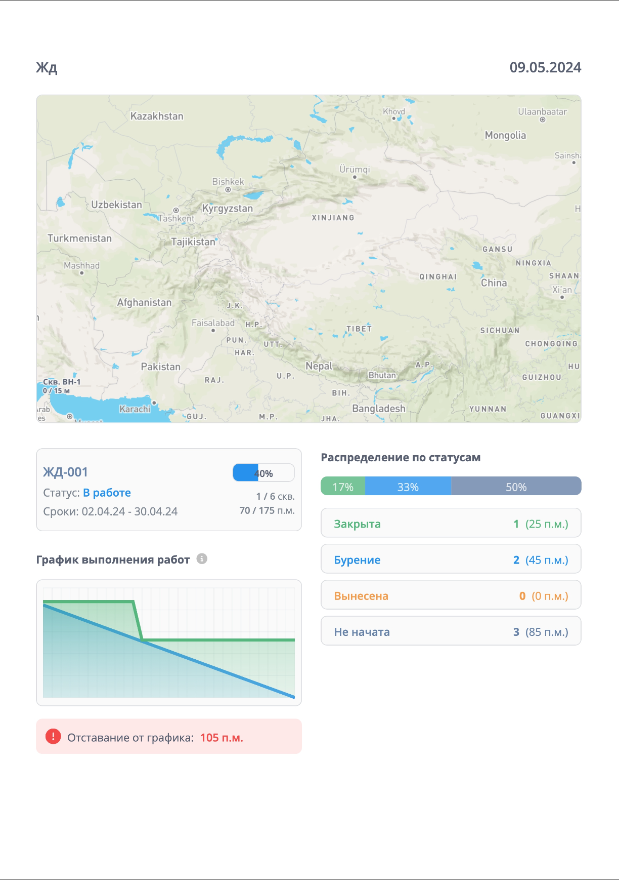 - Каждая скважина на карте окрашена в цвет, соответствующий статусу (закрыта, бурение, вынесена, не начата). Рядом с маркером указан номер, глубина бурения (факт / план) и статус скважины.