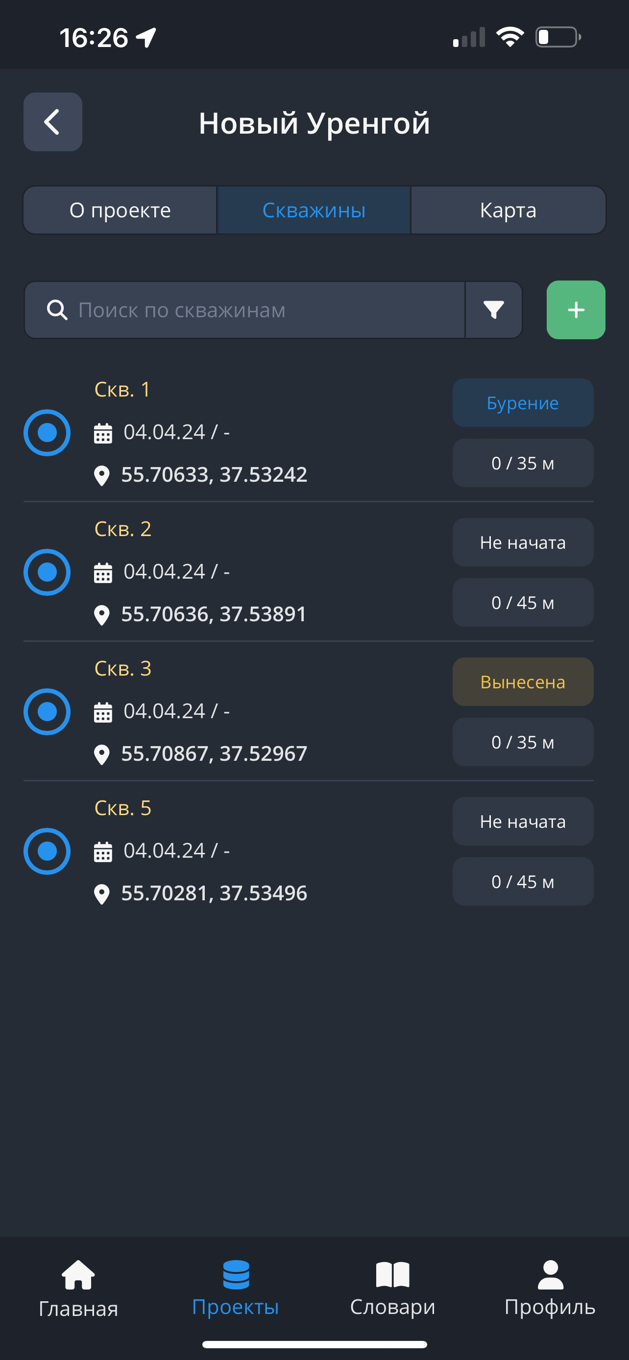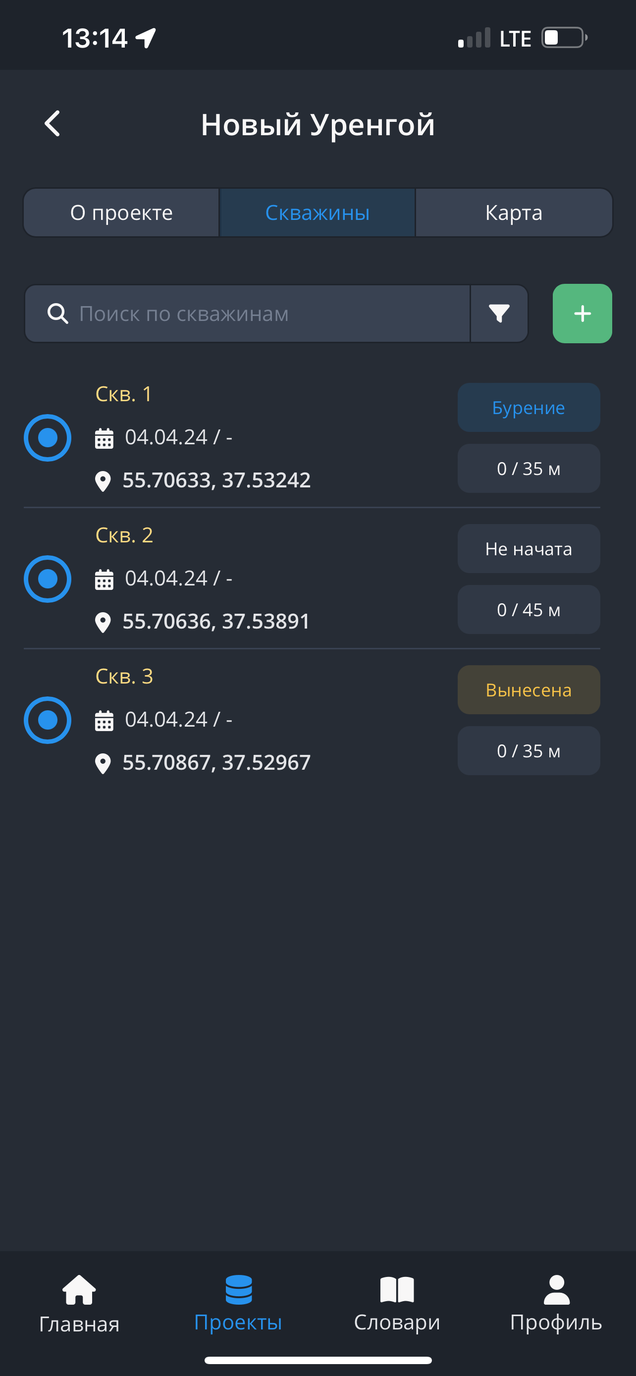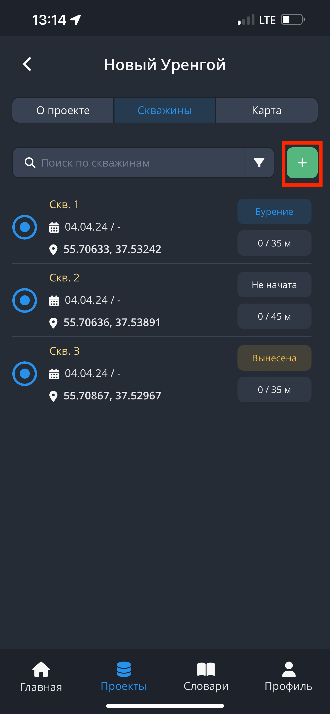 - Чтобы создать новую скважину в разделе "Скважины", нажимаем на кнопку “+”.