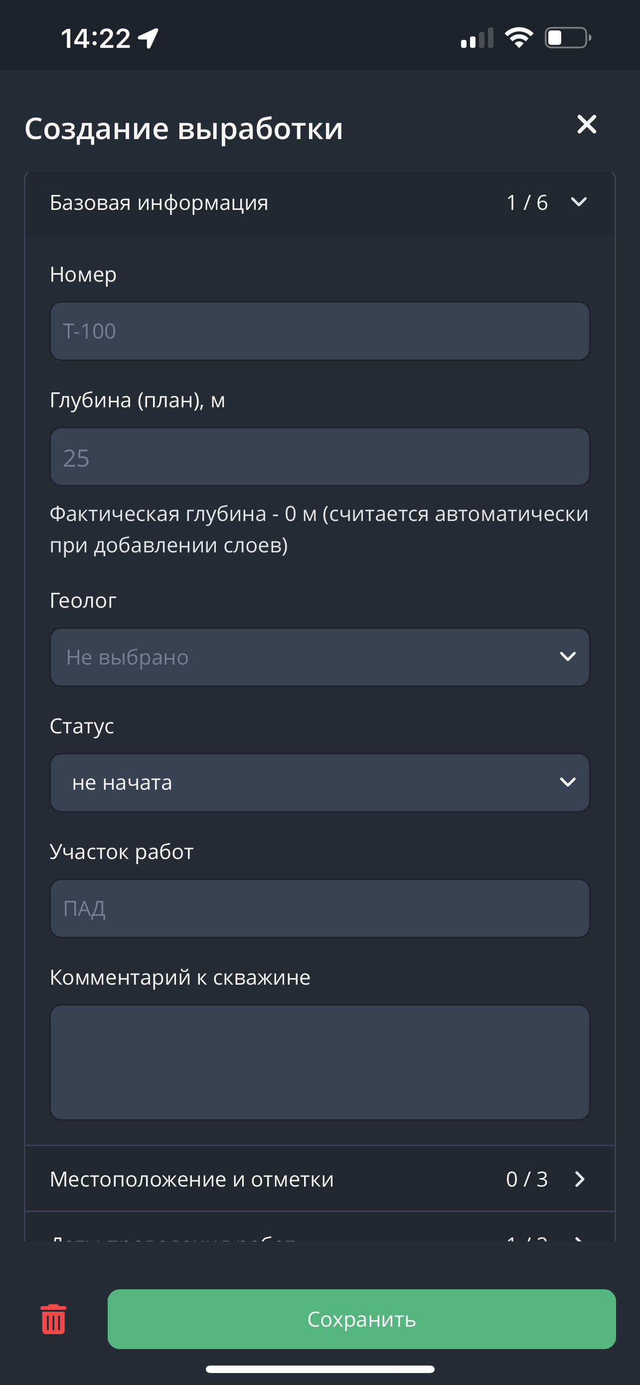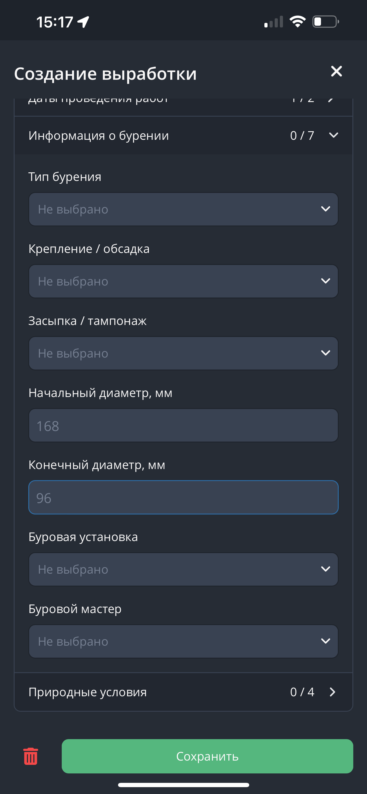 - Создание выработки подразумевает заполнение информации по скважине. Указываем базовую информацию: номер скважины, планируемую глубину, геолога, статус выработки, участок работ. Также есть возможность оставить комментарий.