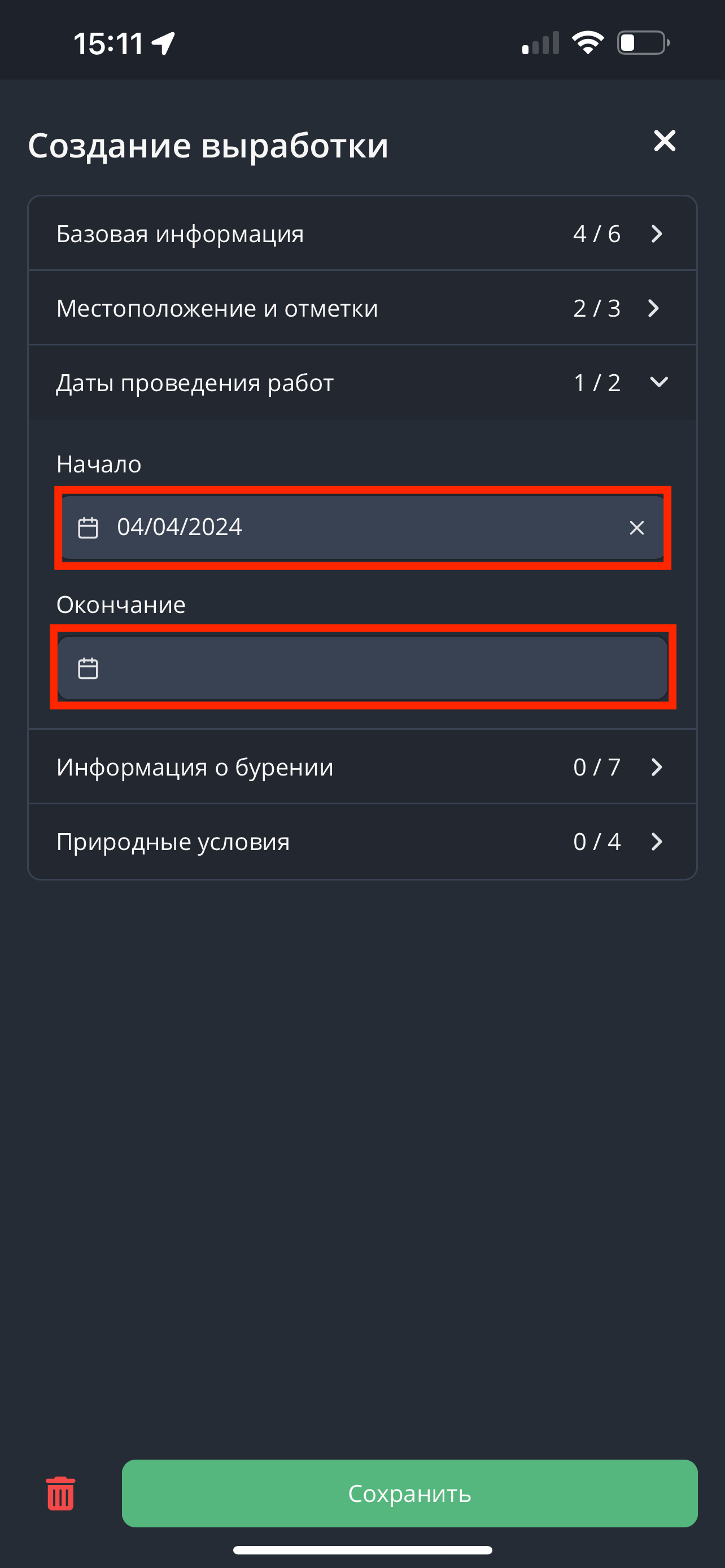 После заполнения информации о местоположении отметках переходим в раздел "Даты проведения работ". Заполняем поля "Начало" и "Окончание".