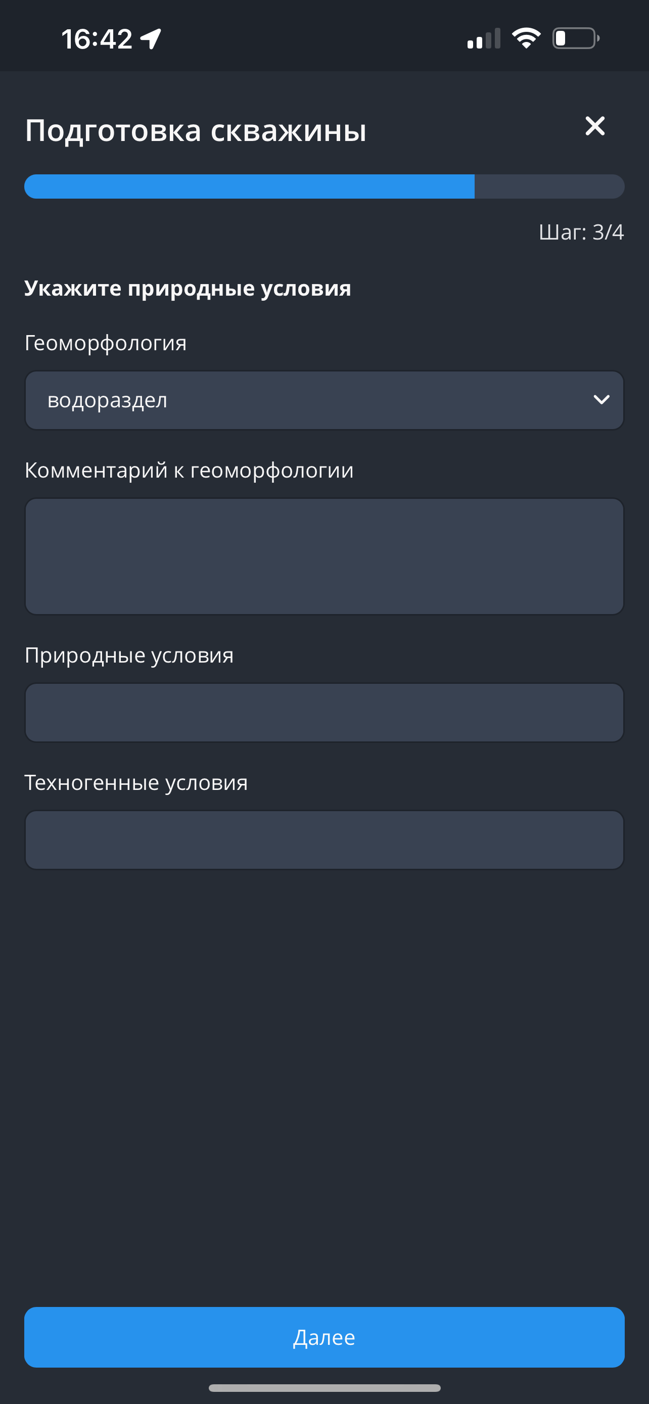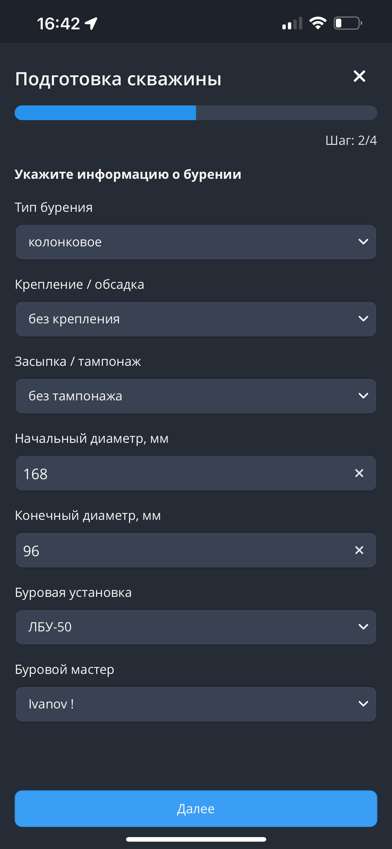 - Указываем информацию о бурении, затем нажимаем на кнопку "Далее".