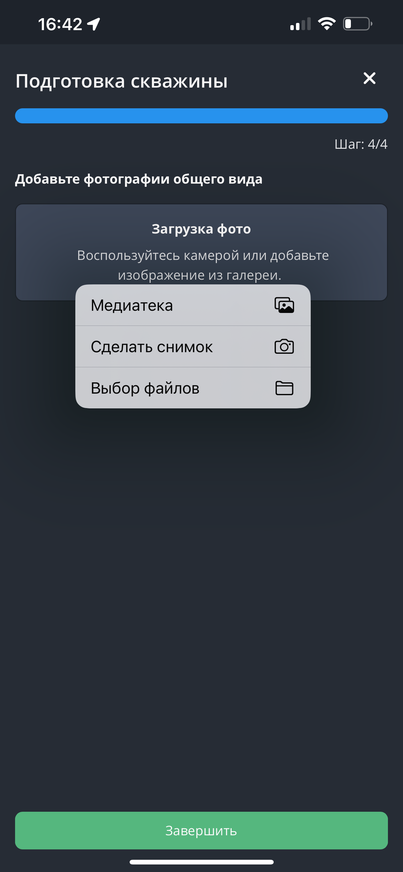 - Загружаем фотографии общего вида скважины. Для добавления фотографий необходимо нажать на кнопку «Загрузка фото», выбрать изображения из галереи устройства или сделать снимок. Раздел “Фотографии” позволяет пользователю загрузить несколько фото. Нажимаем на кнопку "Завершить".