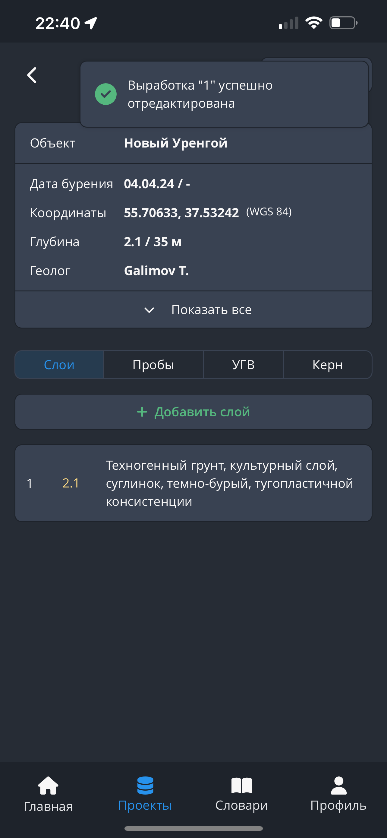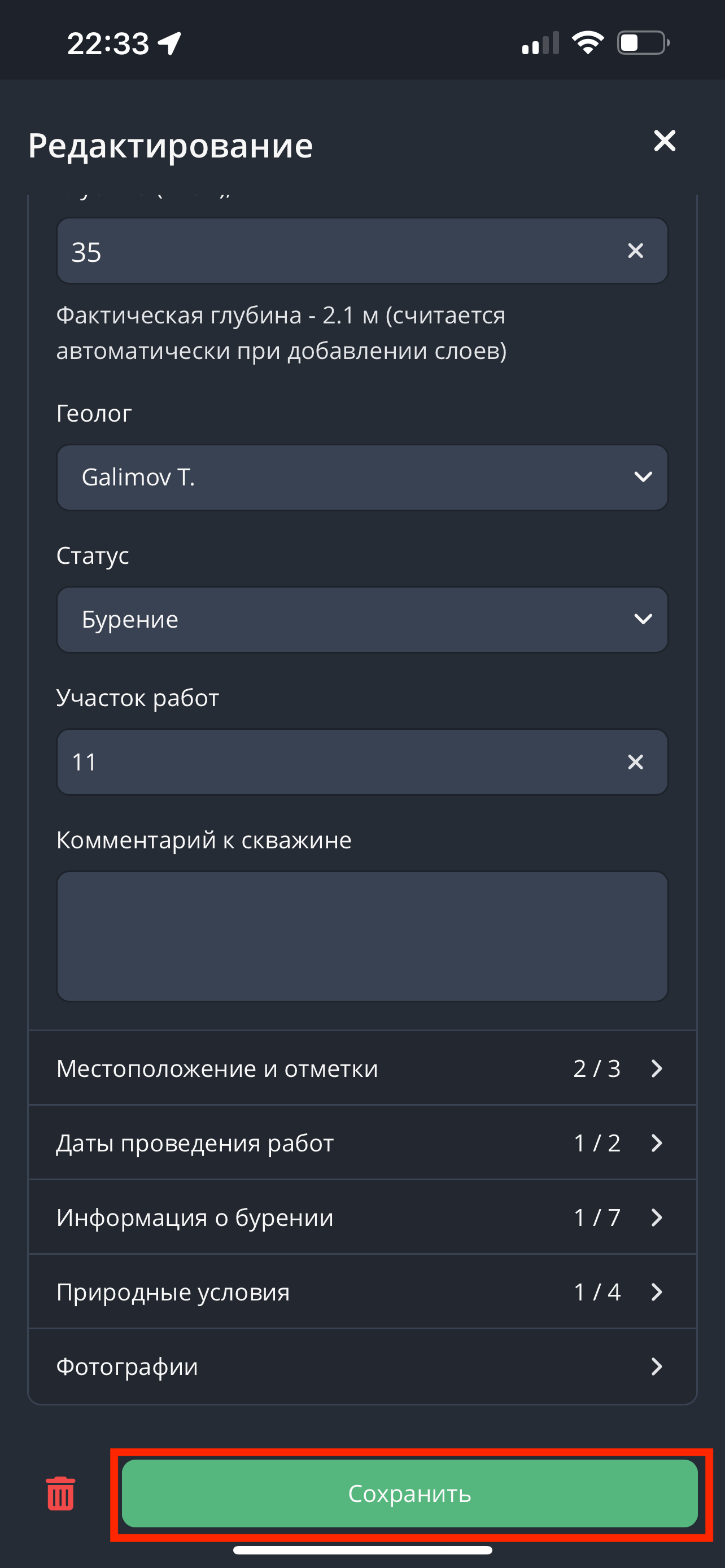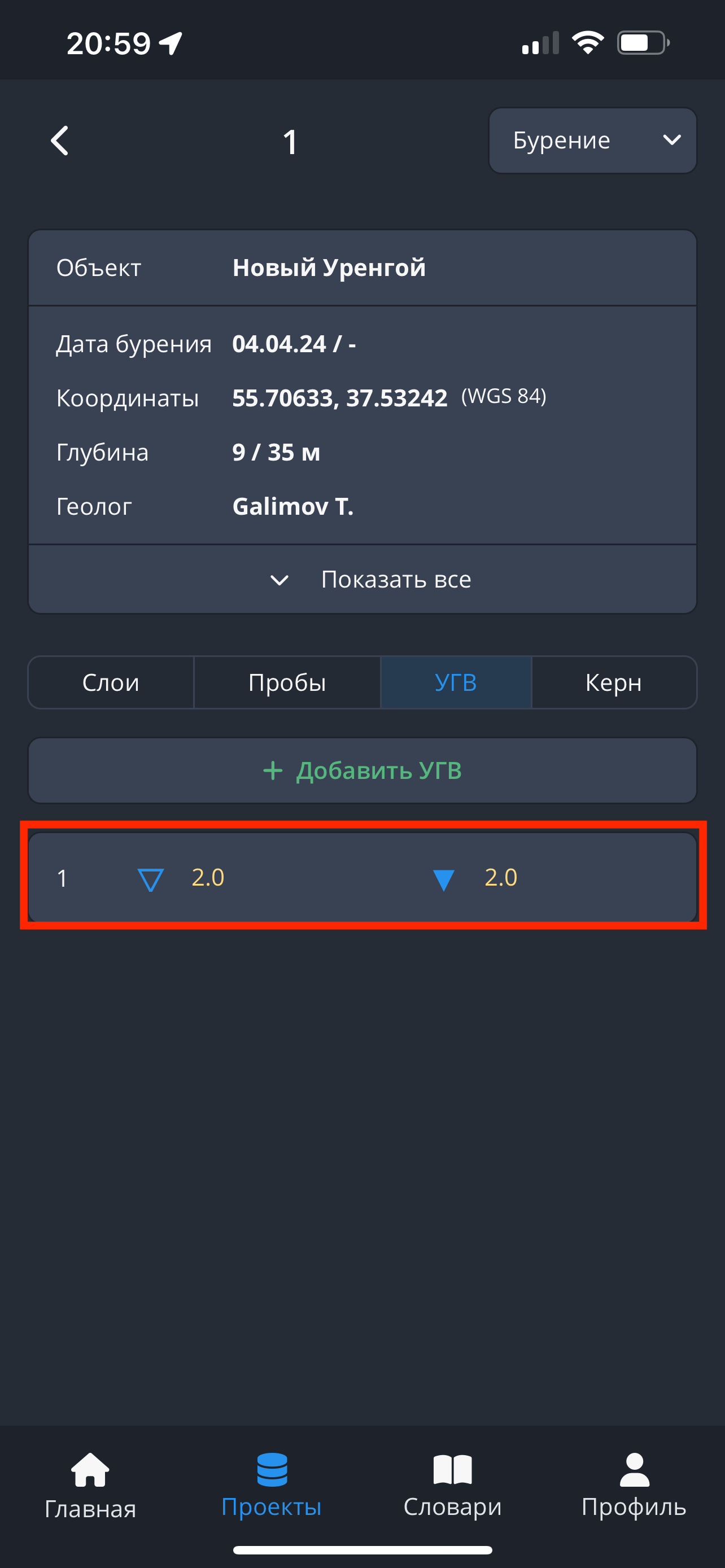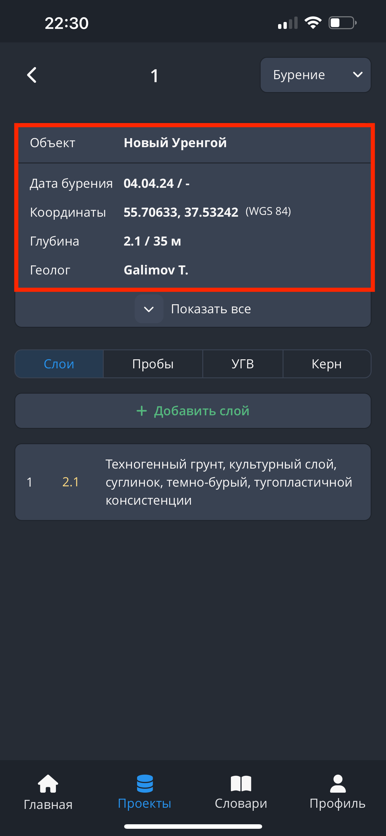 - В приложении Soilbox невозможно добавление слоёв, проб, УГВ и керна в скважины со статусом “Не начата”. Для того, чтобы добавить данные инженерно-геологических скважин, необходимо изменить статус выработки.