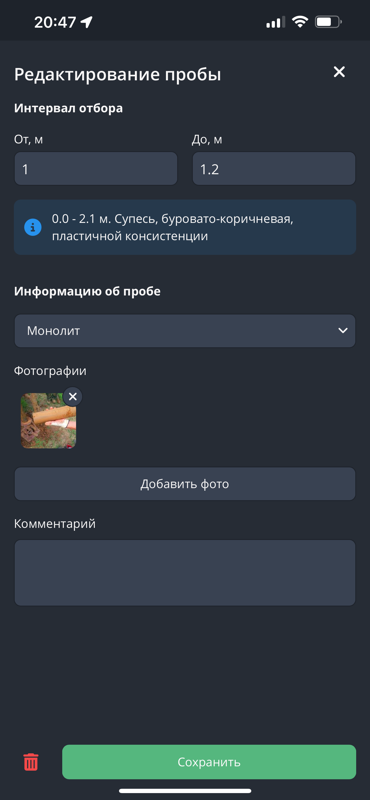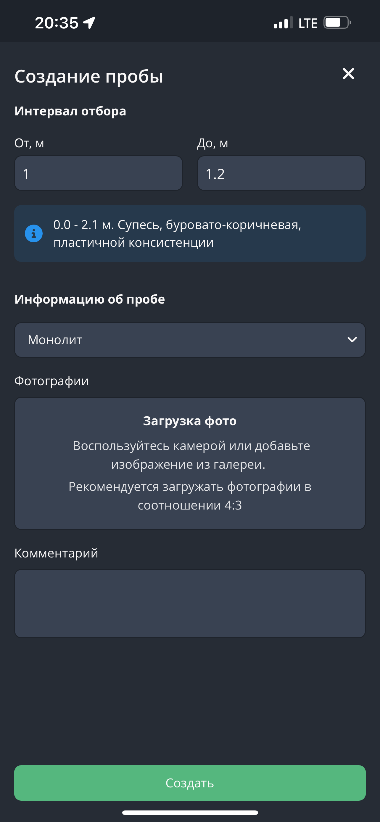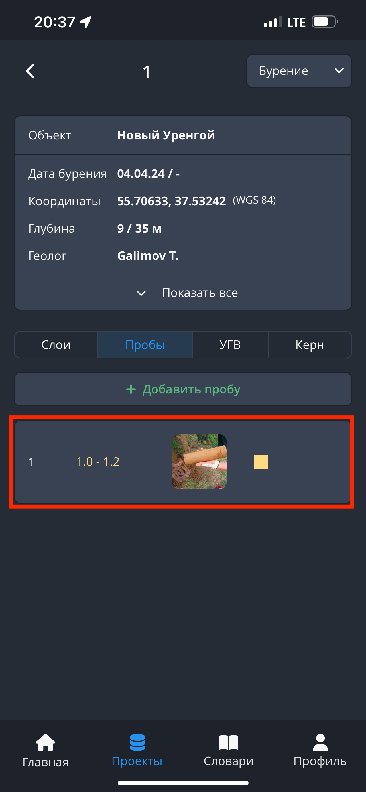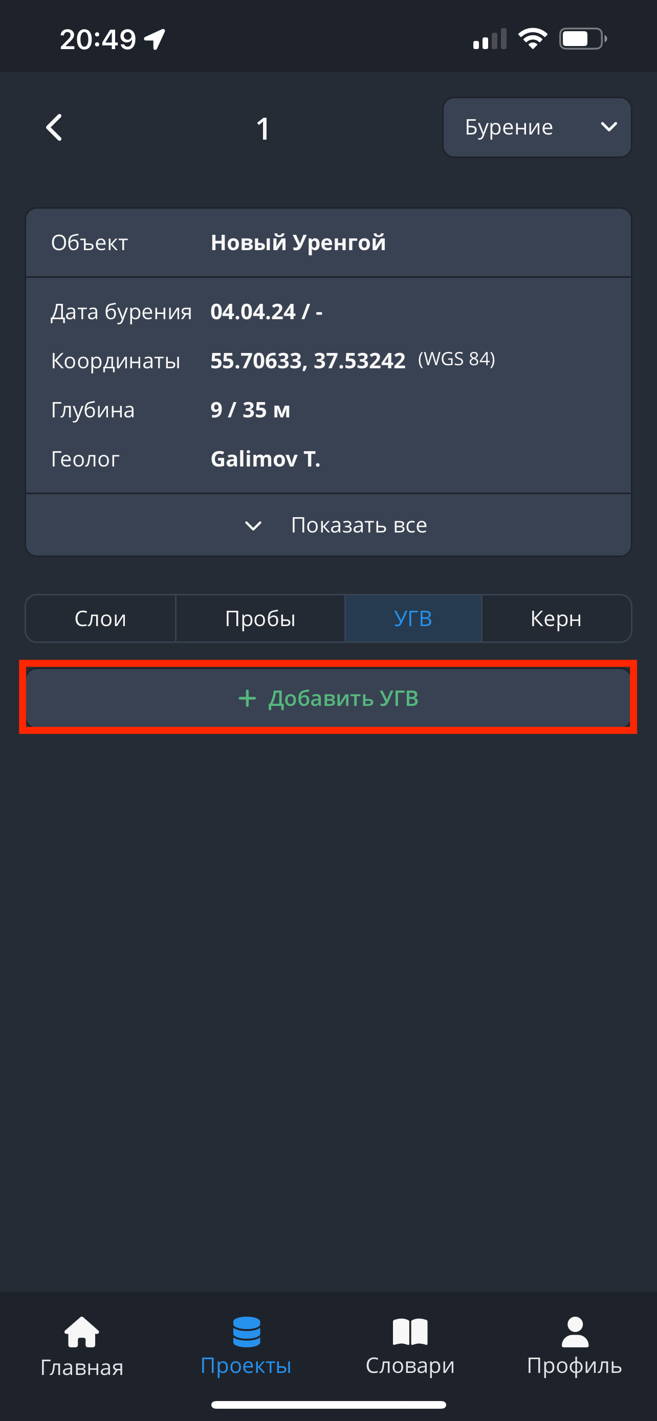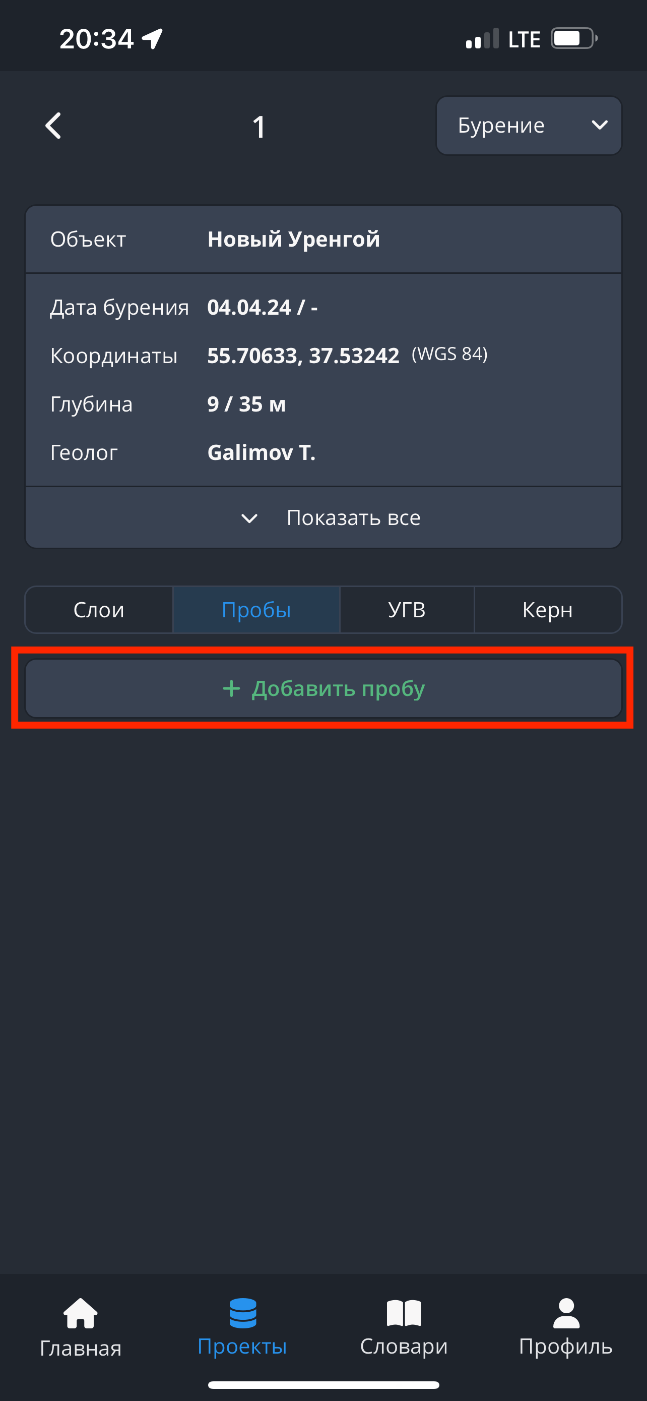 - В приложении Soilbox невозможно добавление слоёв, проб, УГВ и керна в скважины со статусом “Не начата”. Для того, чтобы добавить данные инженерно-геологических скважин, необходимо изменить статус выработки.