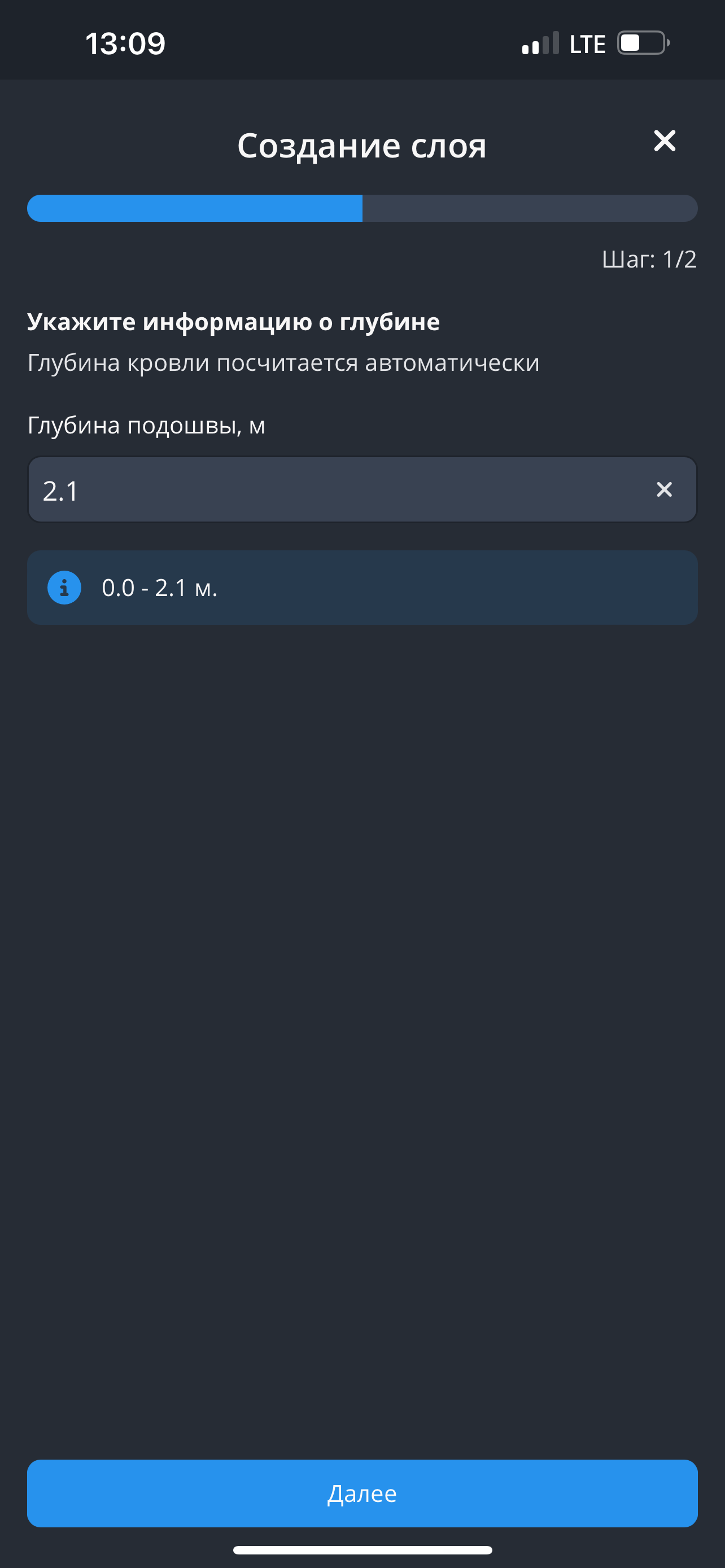 - Для начала описания слоев нажимаем на кнопку "Добавить слой" и указываем глубину подошвы, затем нажимаем на кнопку "Далее".