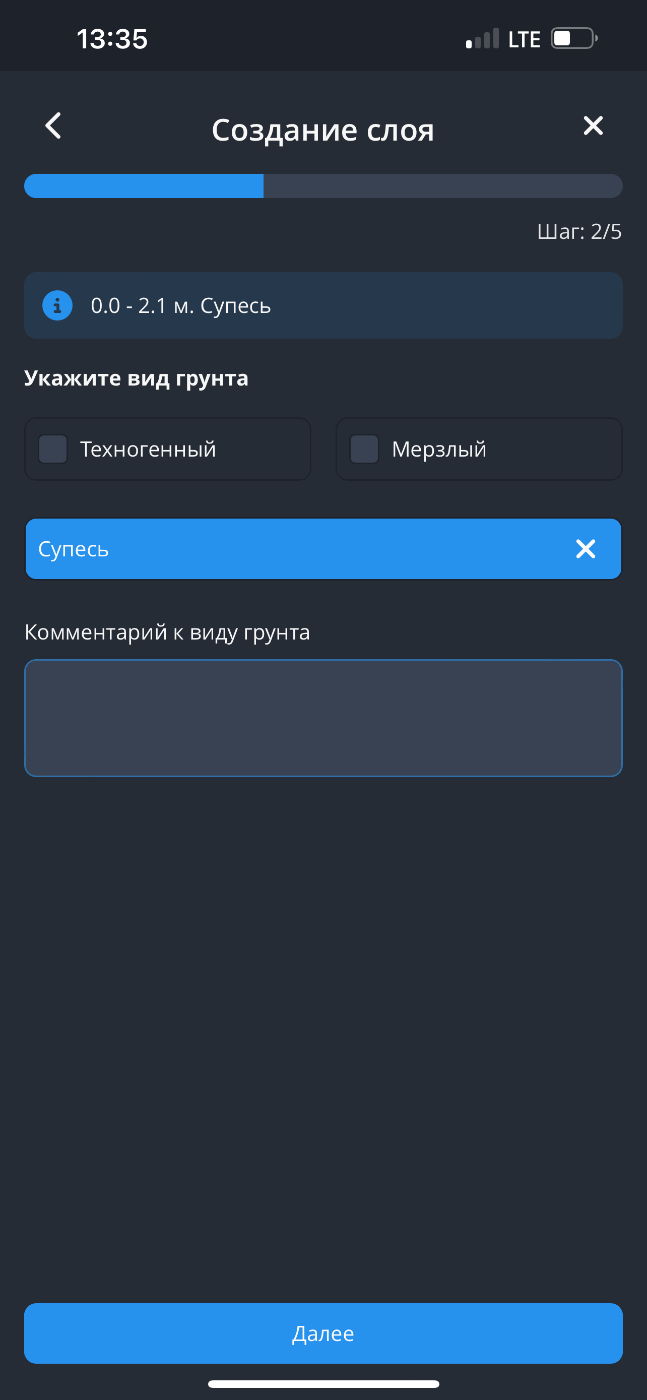 - Далее выбираем тип грунта. При выборе грунта остальные варианты выбора свернутся. Затем нажимаем на кнопку "Далее".