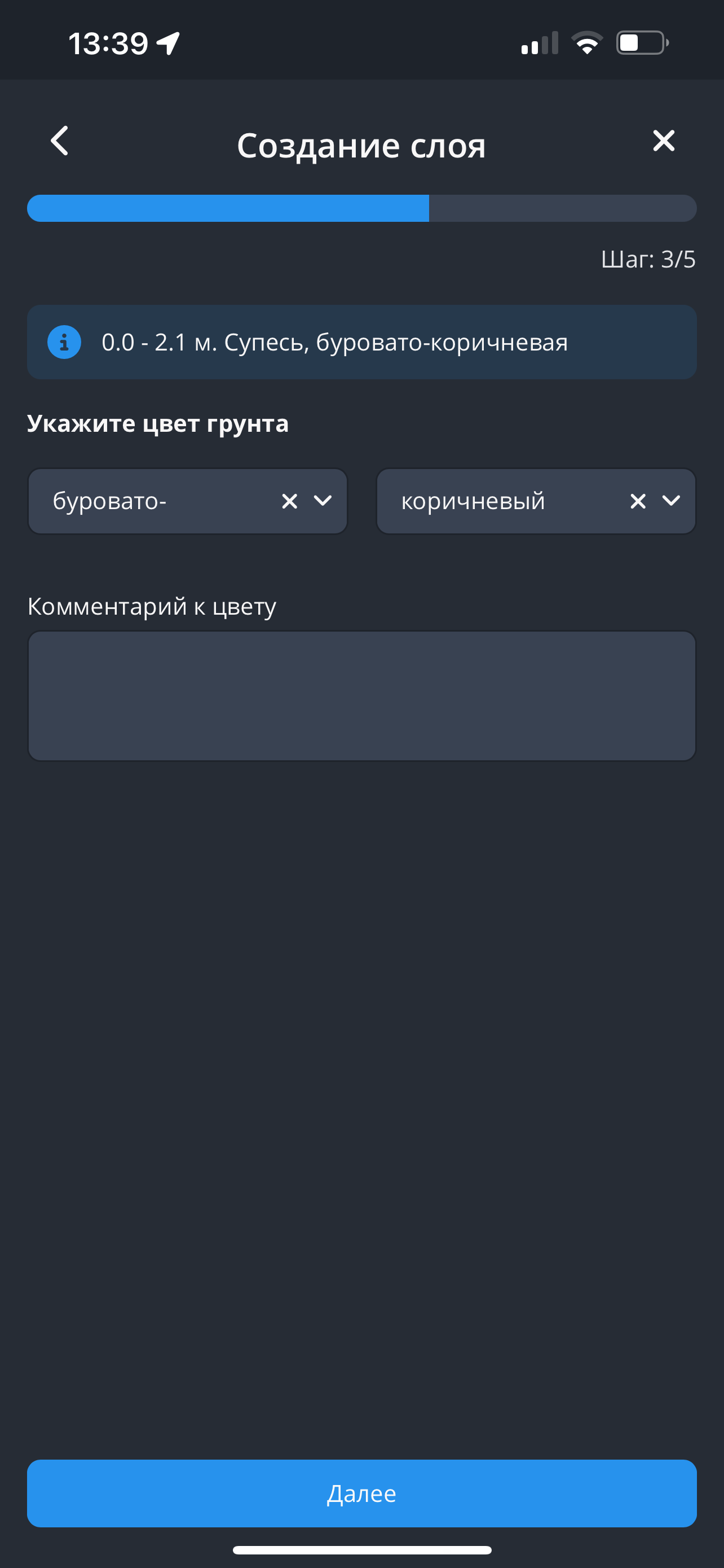 - Всё послойное описание собрано в уникальную для каждого класса грунтов последовательность описываемых характеристик - “Гид описания”. К каждой характеристике есть возможность добавить комментарий в свободной форме. Опции в выпадающих списках также подстраиваются под разновидность грунта. Одновременно с выбором опций на экране появляется текст полного описания грунта.