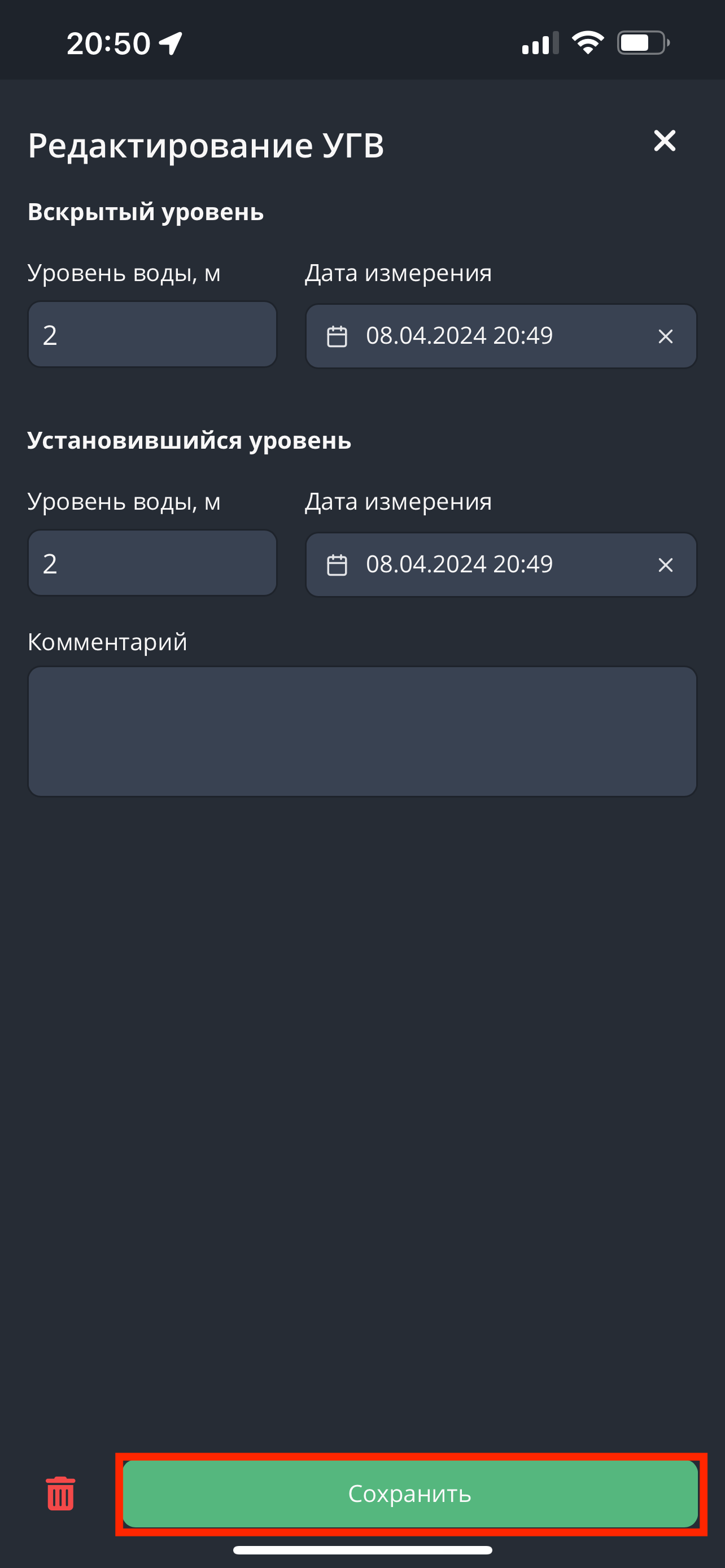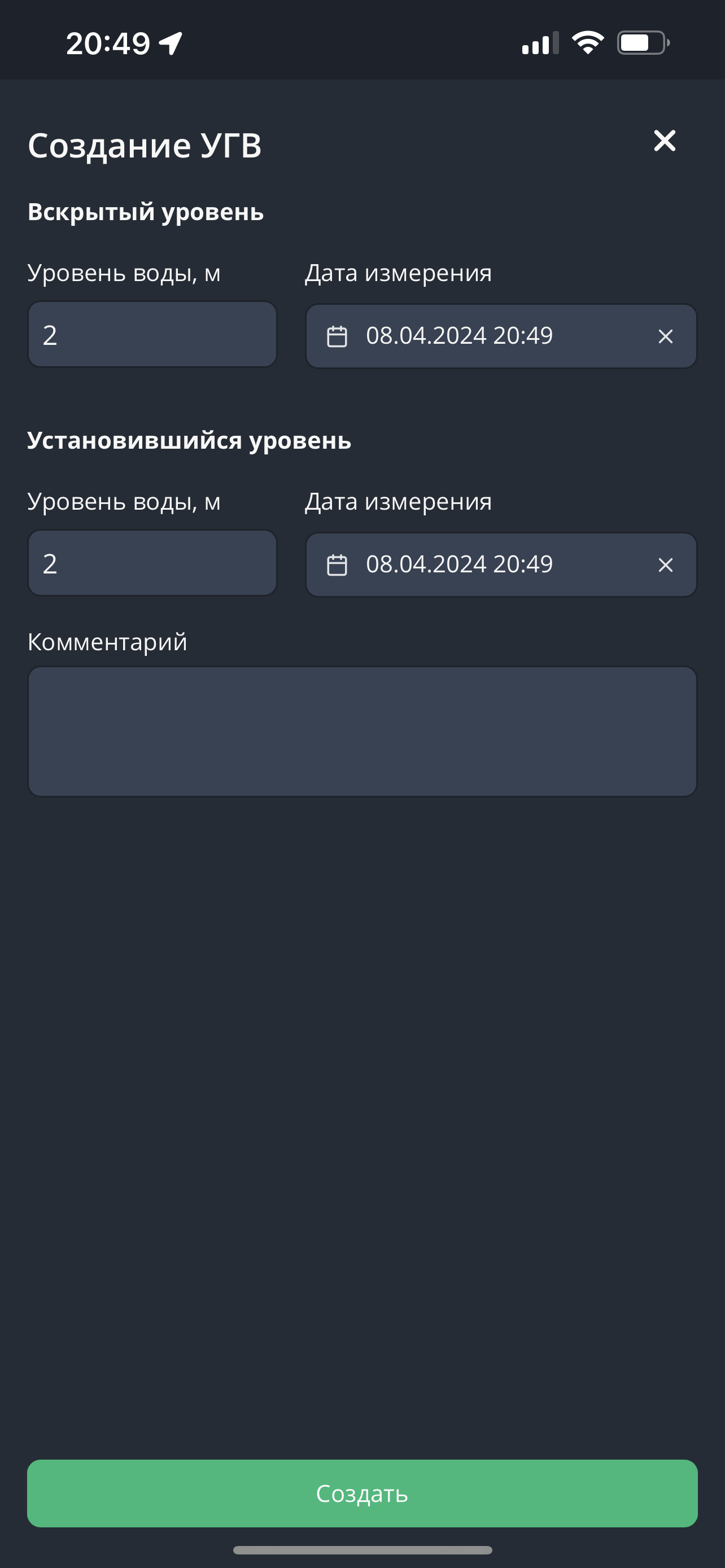 - При добавлении вскрытого или установившегося уровня вод указываем дату измерения.