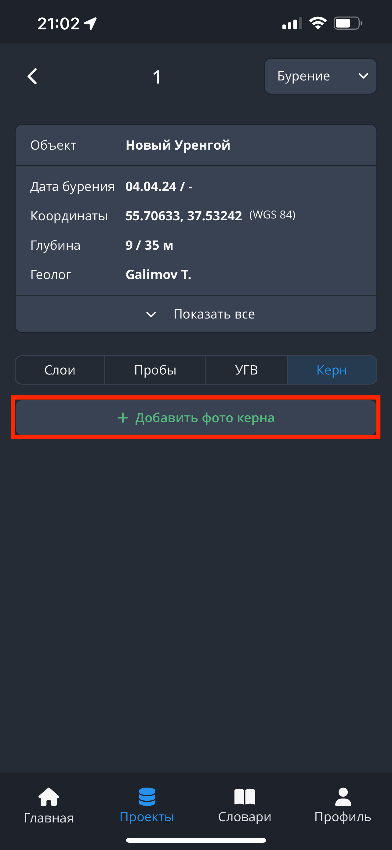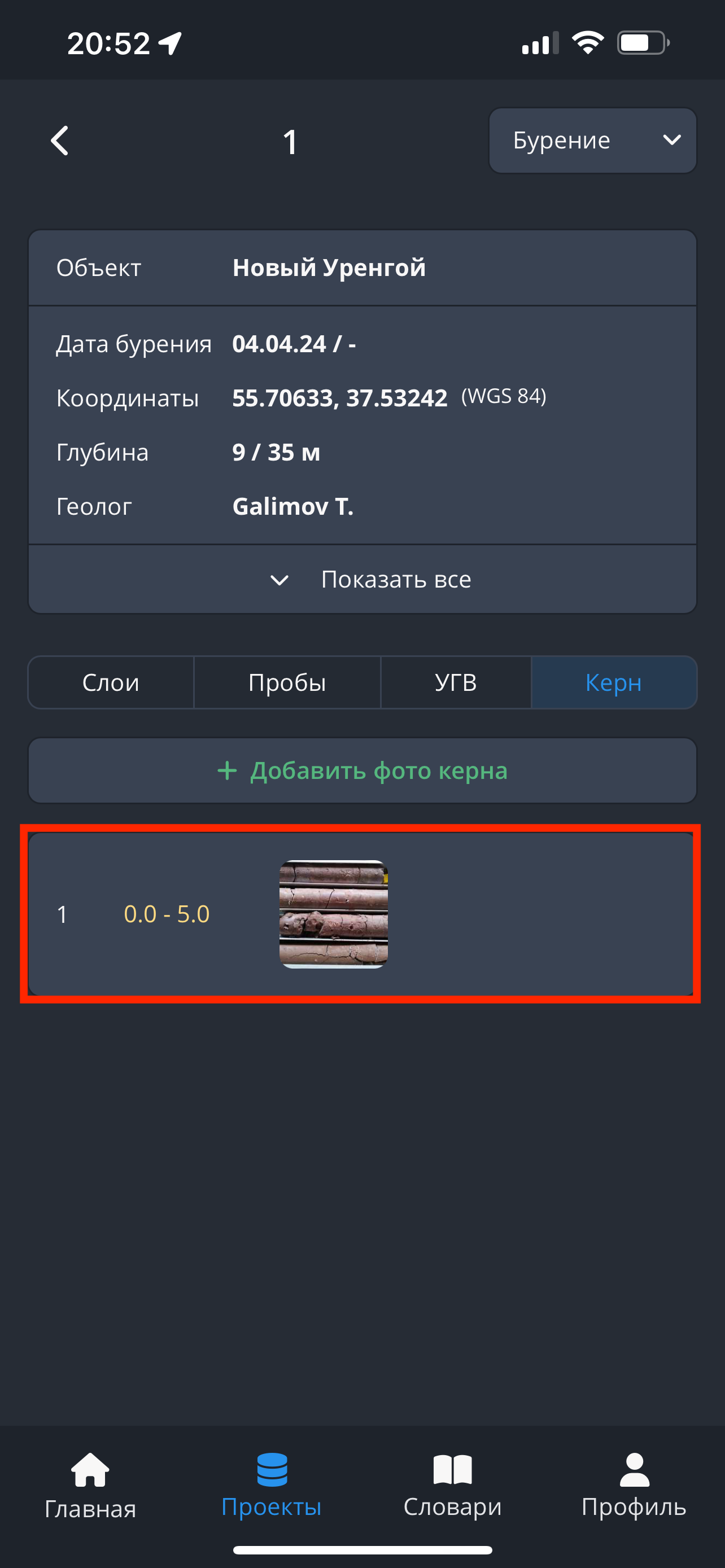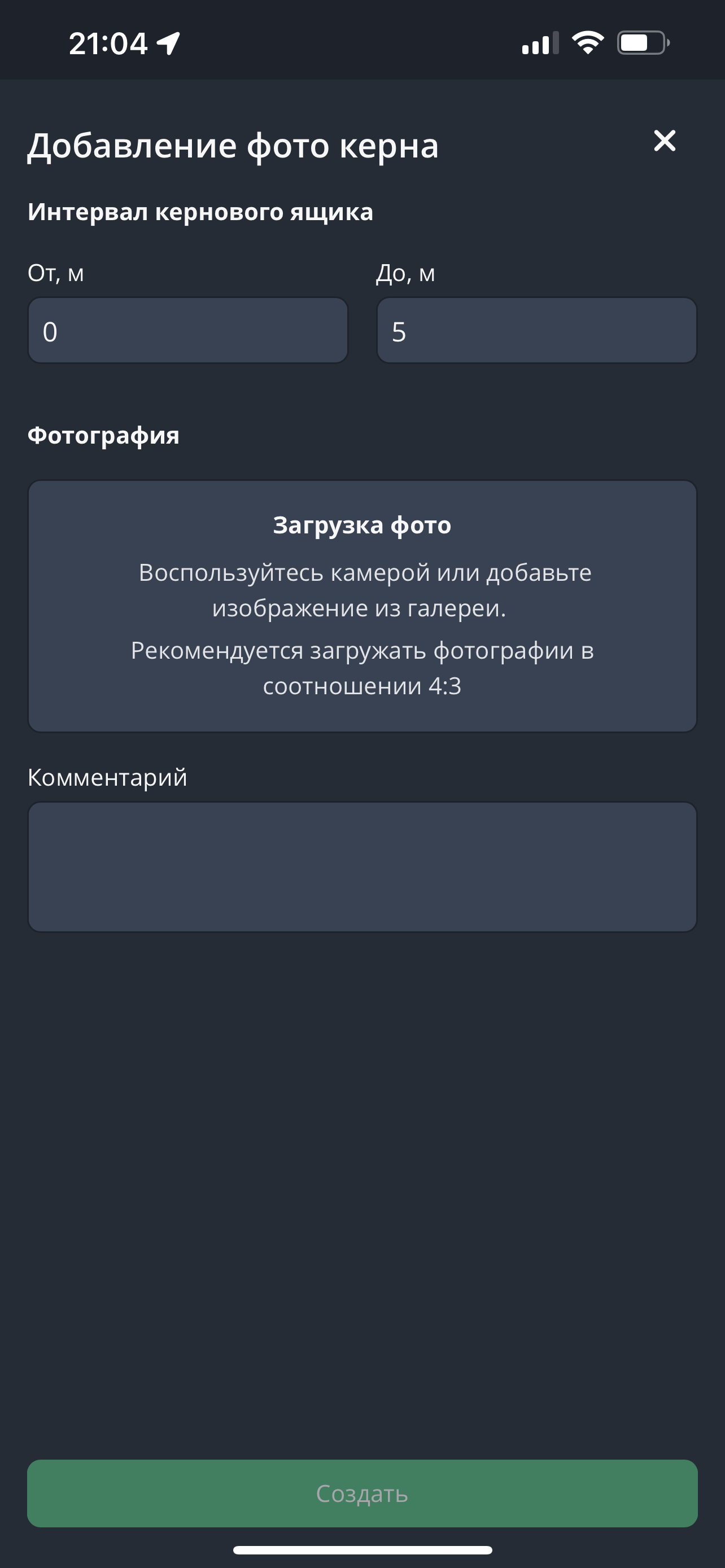 - Во вкладке “Фото керна” нажимаем на кнопку "Добавить фото керна". Для добавления фотографий необходимо нажать кнопку «Загрузка фото», выбрать изображения из галереи устройства или сделать снимок.