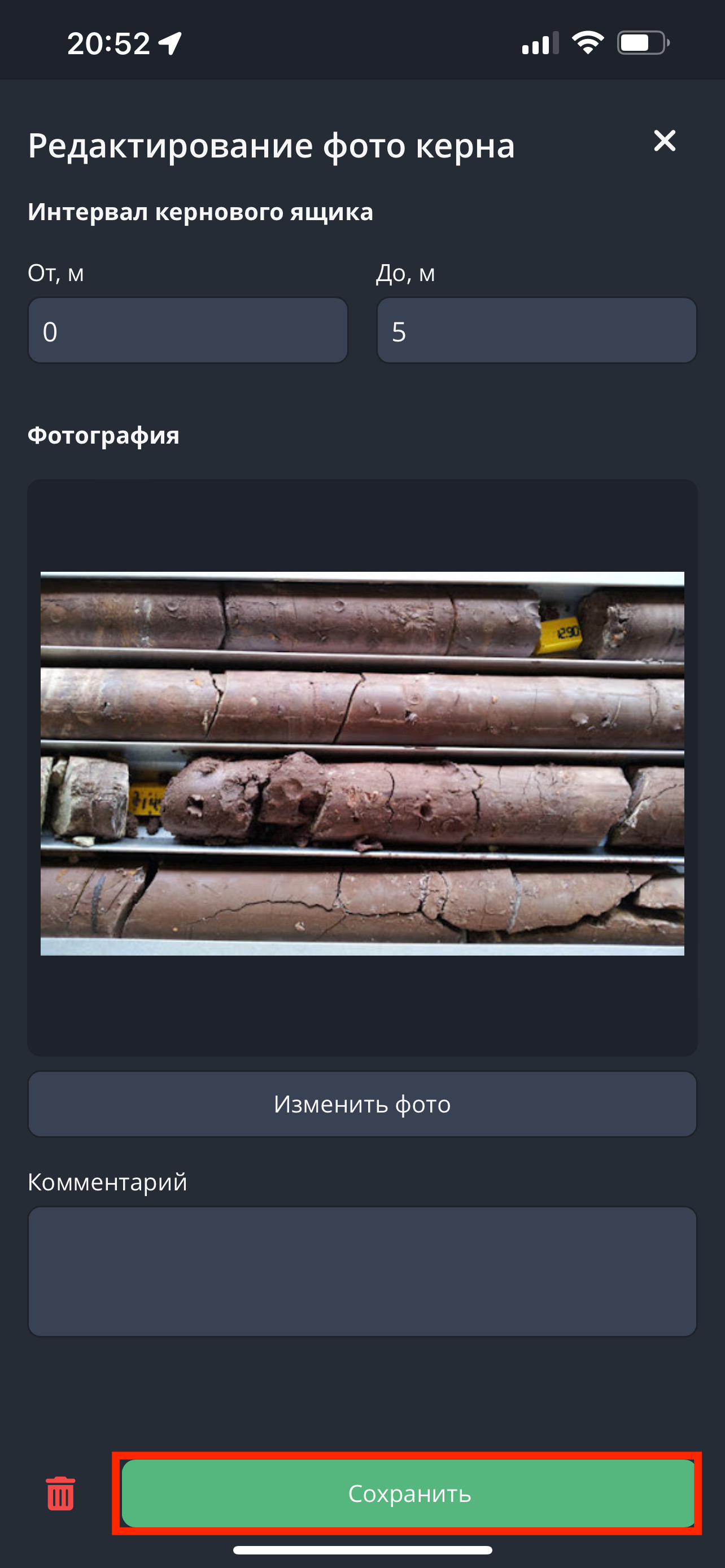 - В разделе "Редактирование фото керна" редактируем интересующую информацию, затем нажимаем на кнопку "Сохранить"