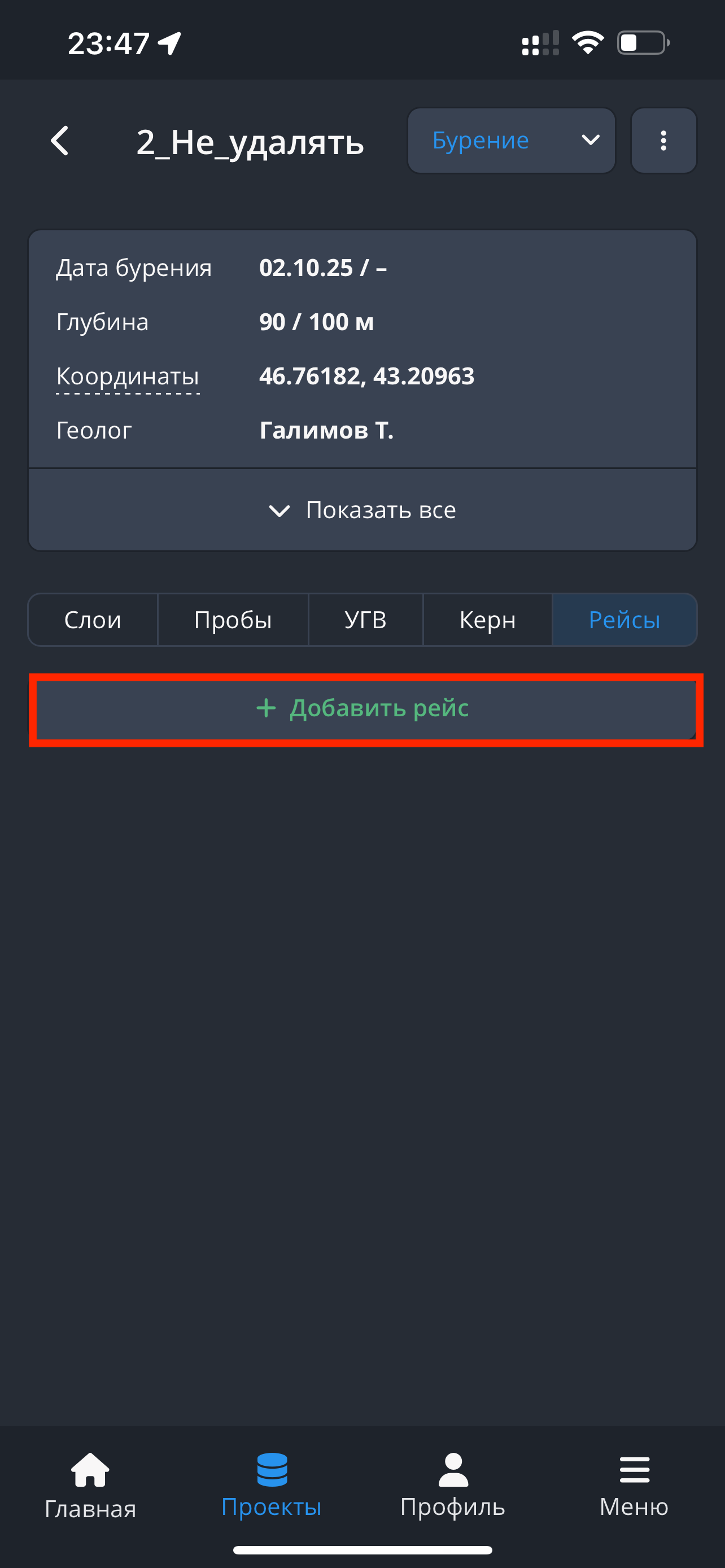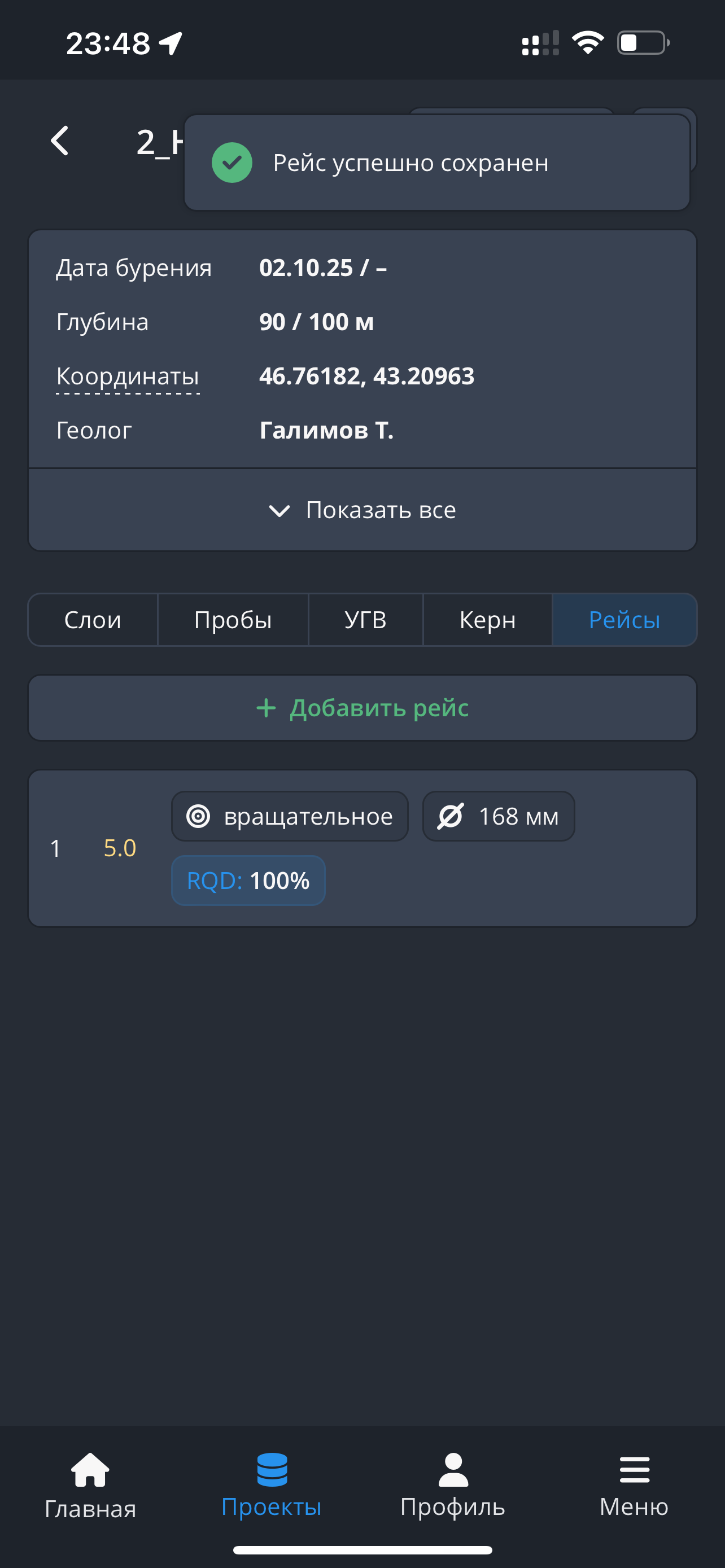 - Готово! Рейс успешно создан и отображается в списке рейсов для выбранной скважины.