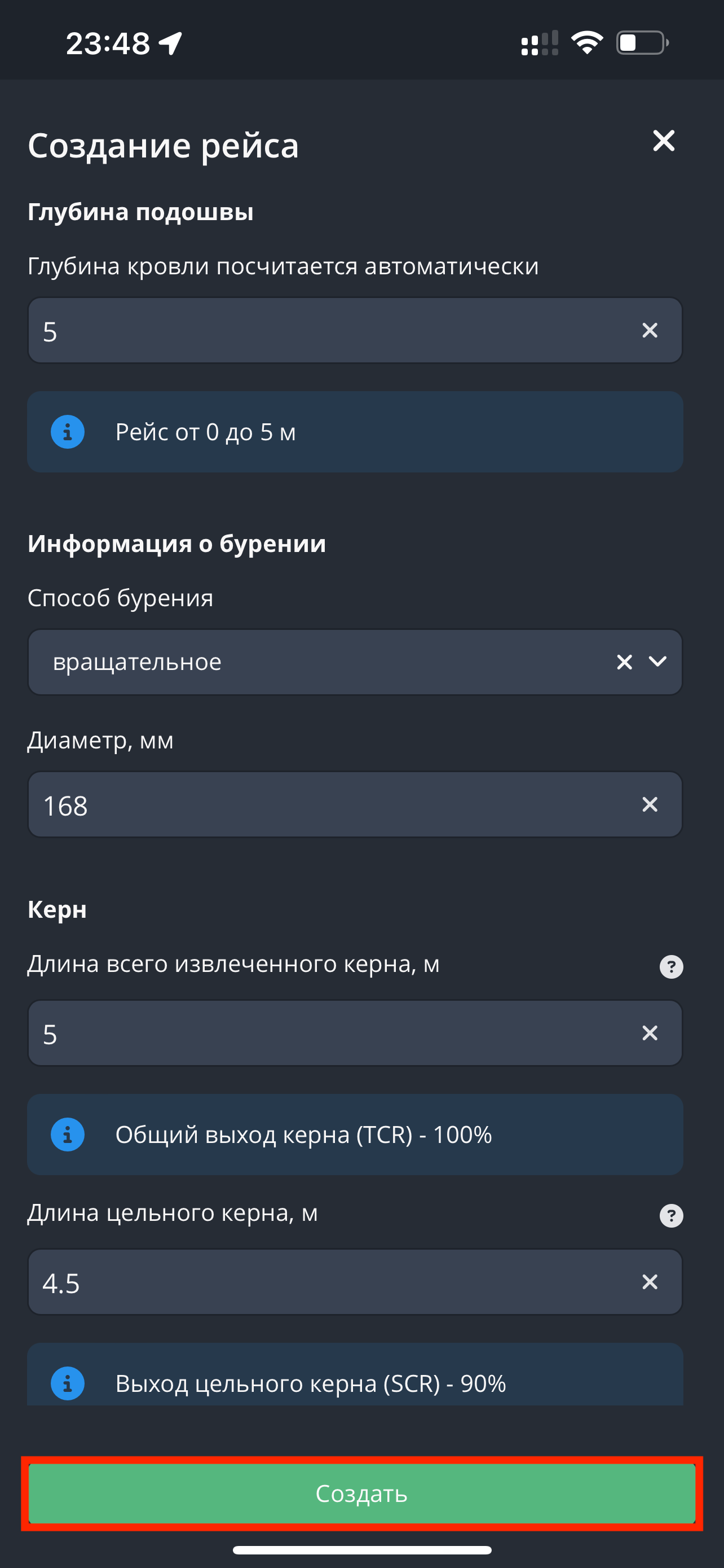 - В открывшемся окне «Создание рейса» указываем глубину подошвы.