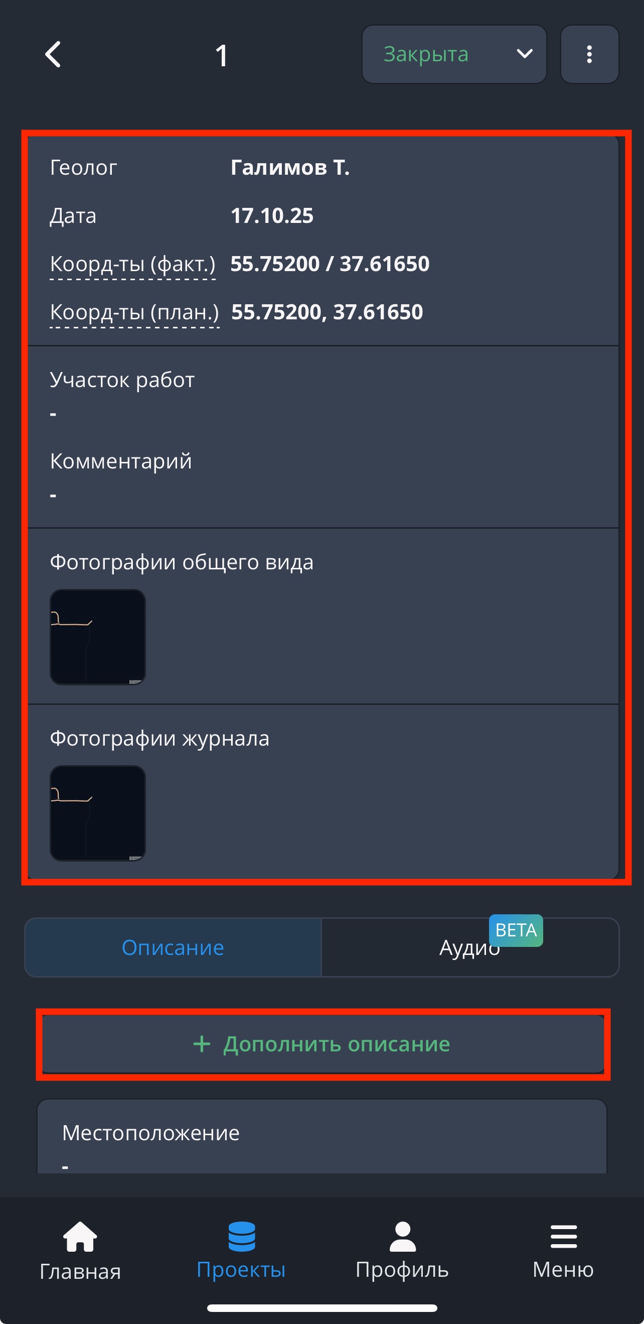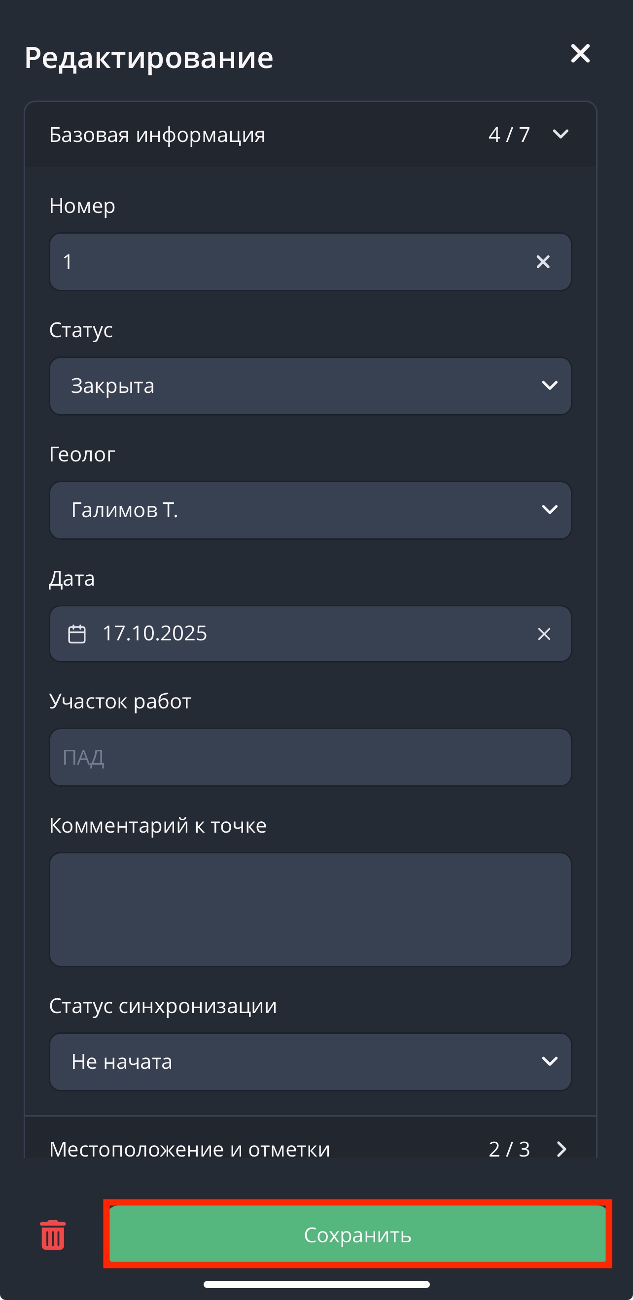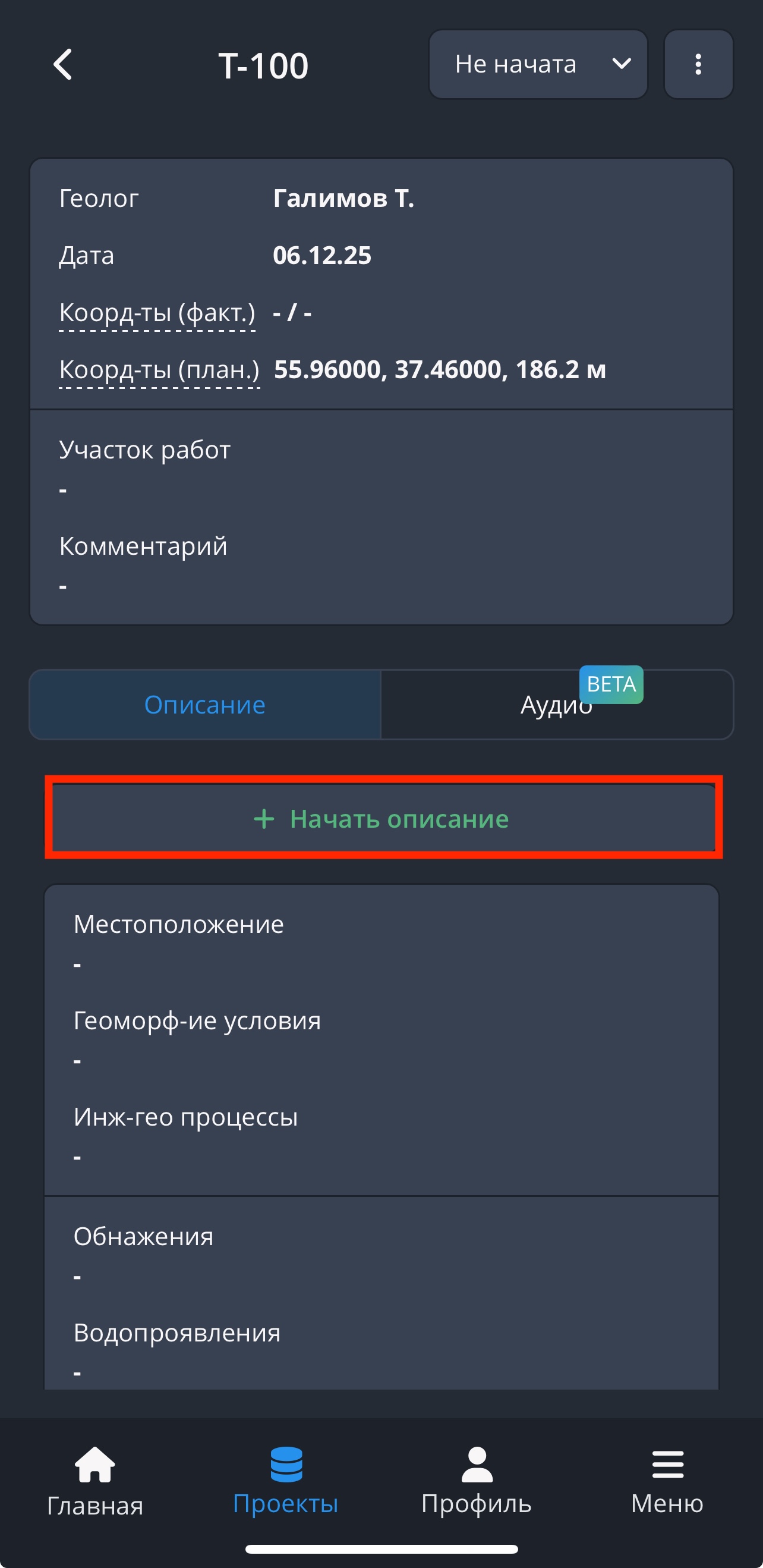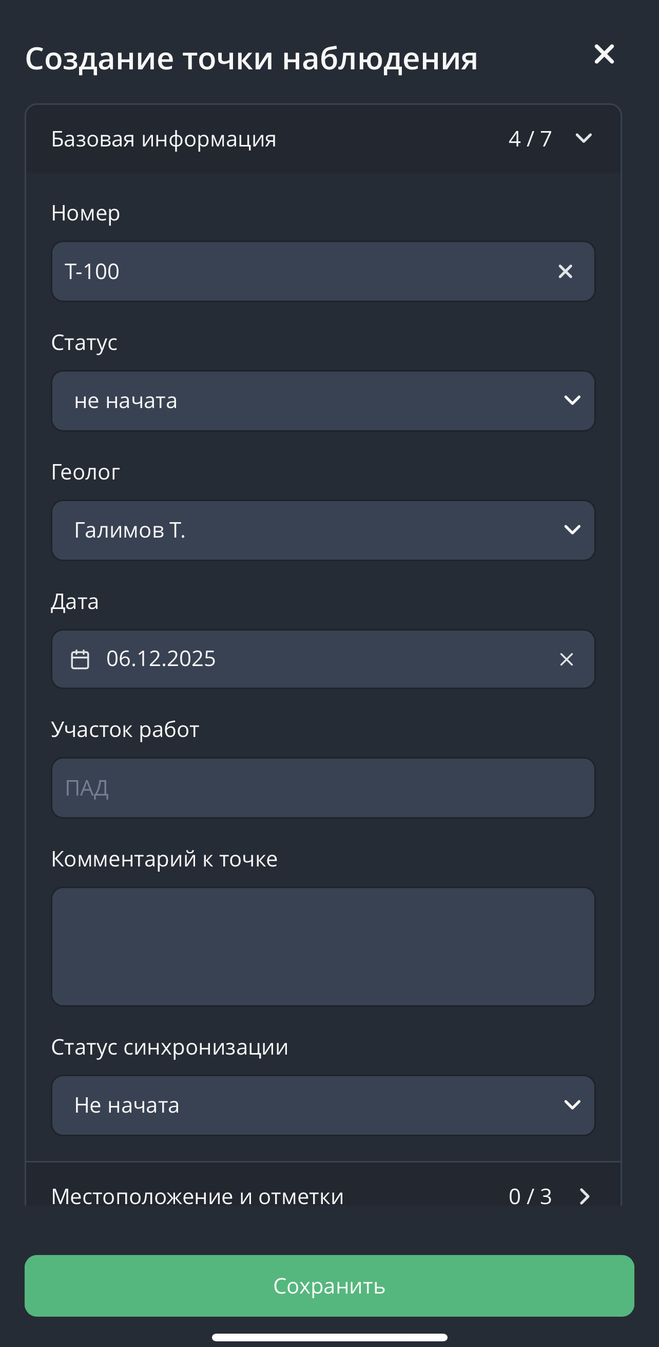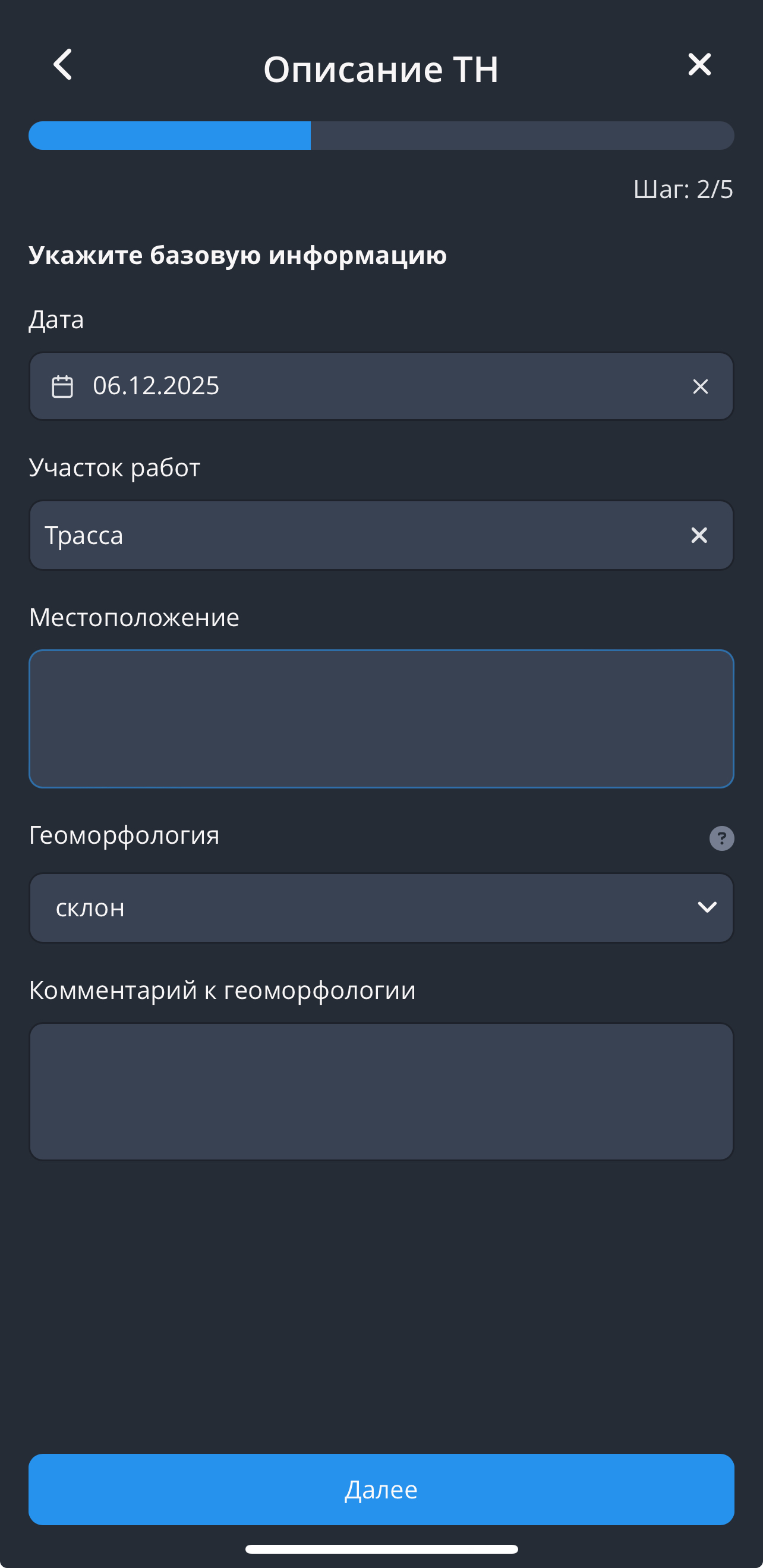 - Указываем базовую информацию: дату, участок работ, текстовое описание местоположения, геоморфологию и комментарий при необходимости. Затем нажимаем на кнопку «Далее».