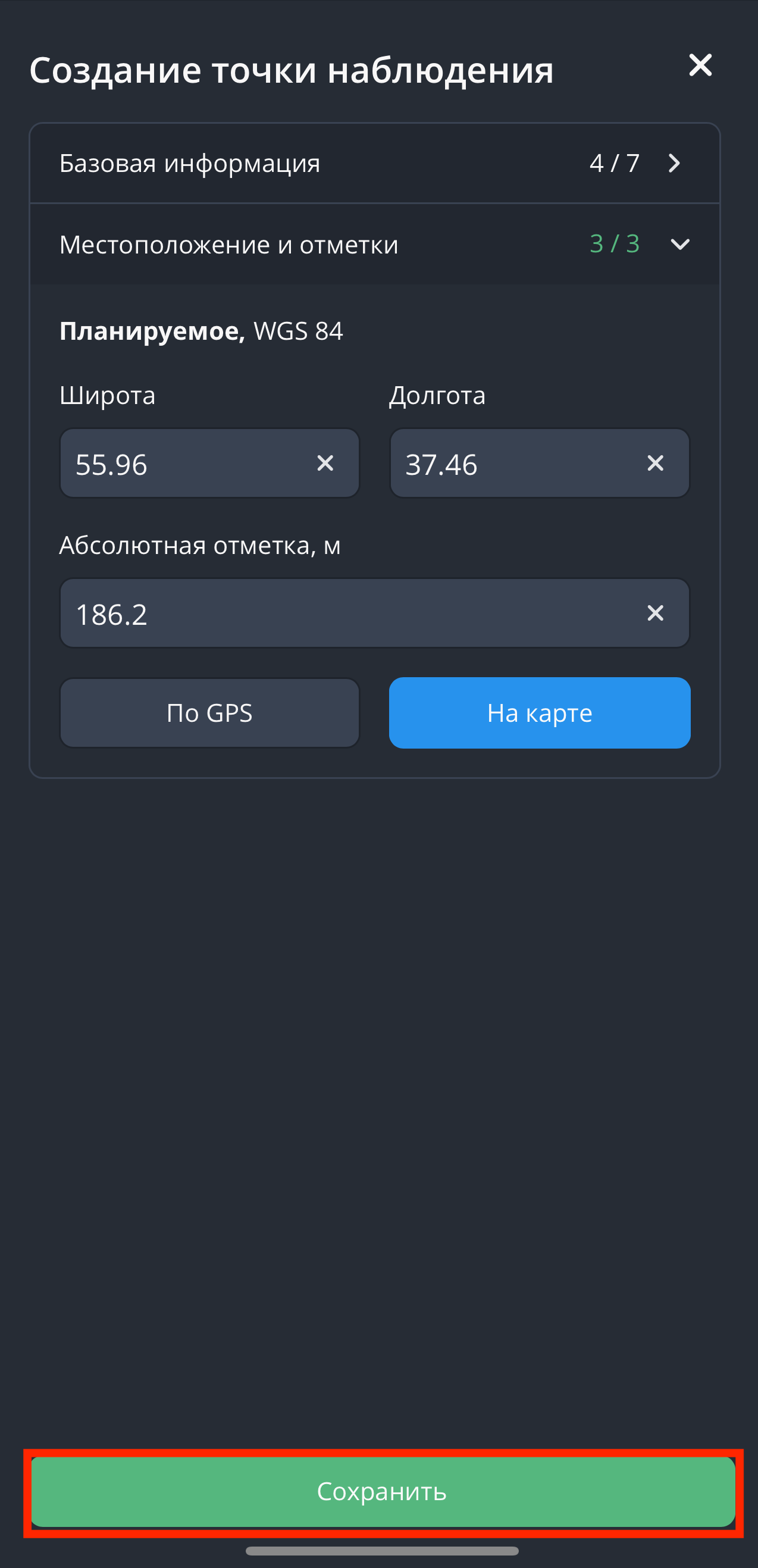Поля «Широта» и «Долгота» будут заполнены автоматически на основе данных GPS.