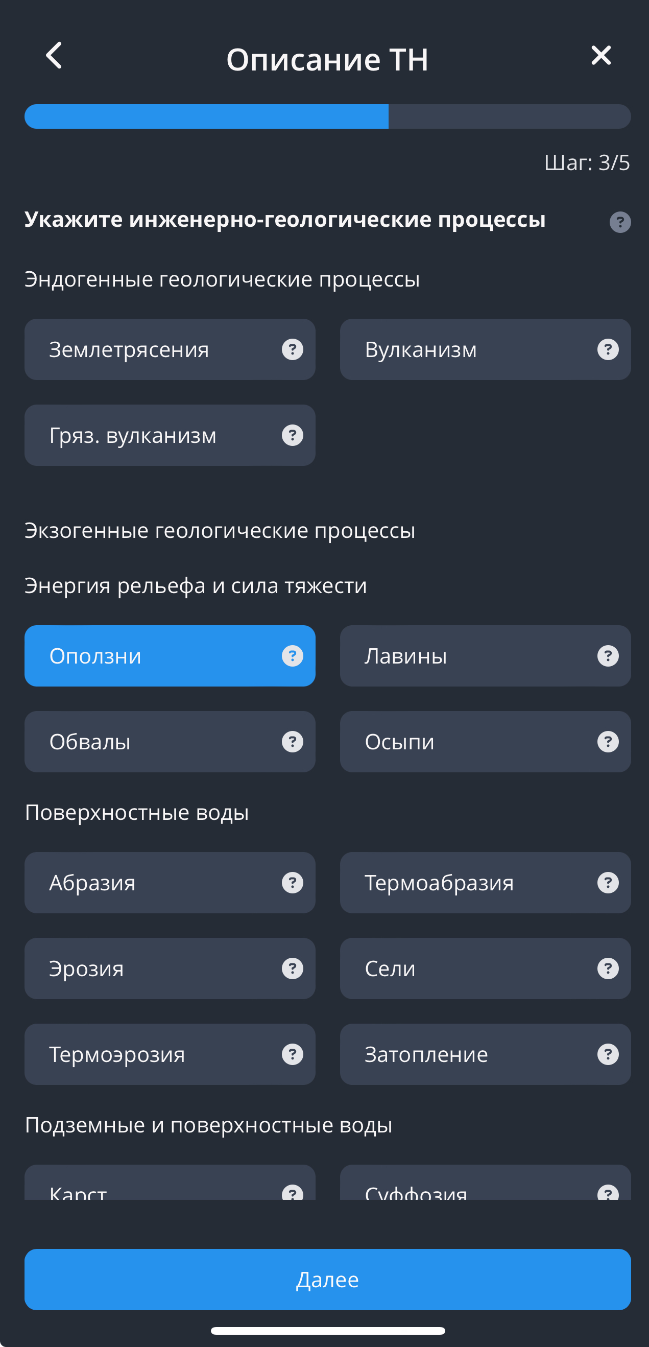- Указываем инженерно-геологические процессы, затем нажимаем на кнопку «Далее».