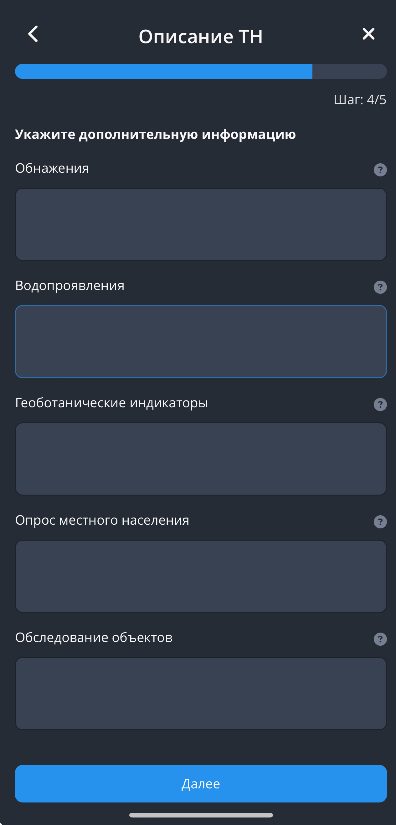 - Указываем дополнительную информацию: обнажения, водопроявления, геоботанические индикаторы, данные опроса местного населения, обследование объектов и комментарий к точке. Затем нажимаем на кнопку «Далее».