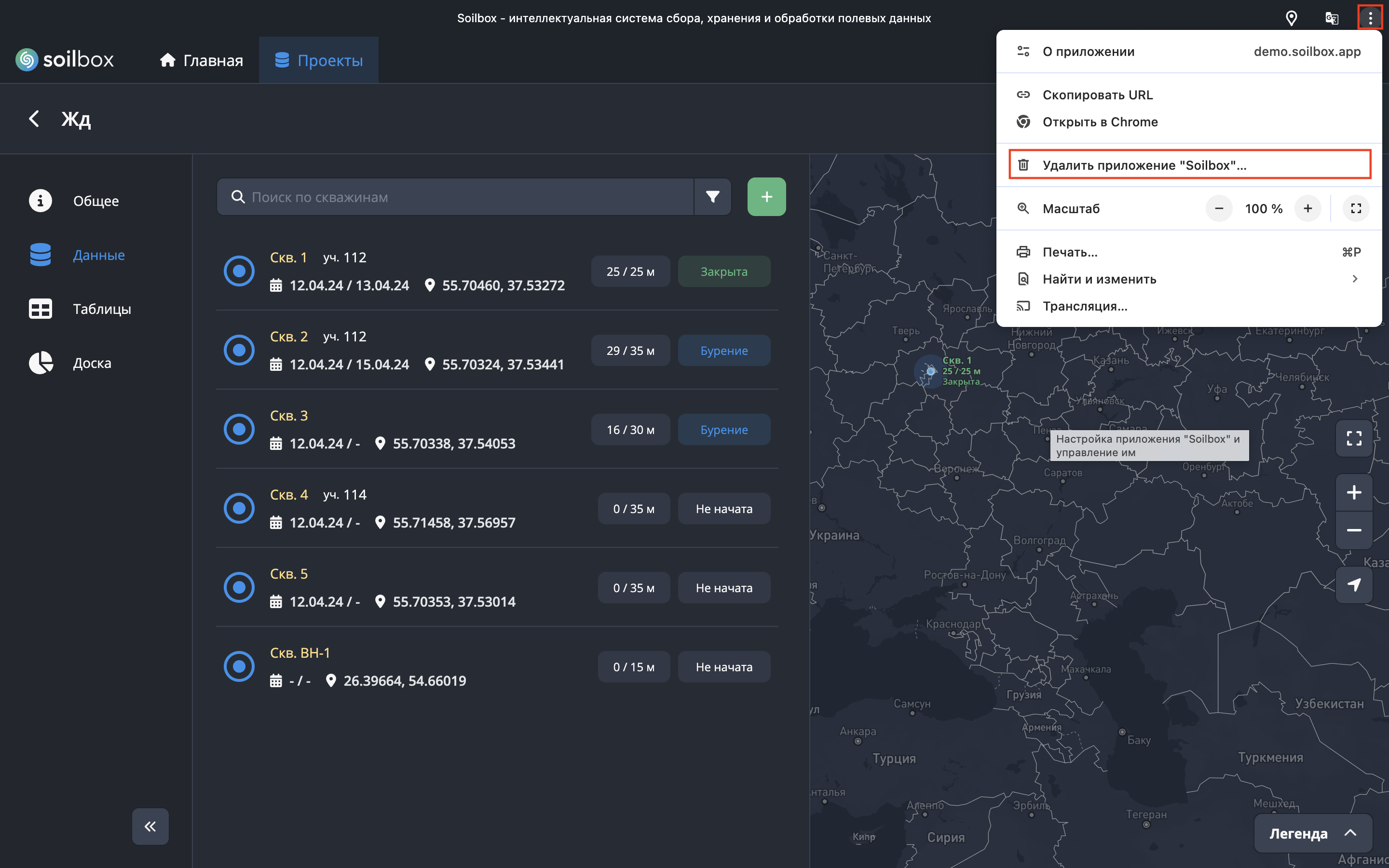 - Нажмите на кнопку "Настройки приложения "Soilbox" и управление им" (вертикальное троеточие) в верхнем правом углу.