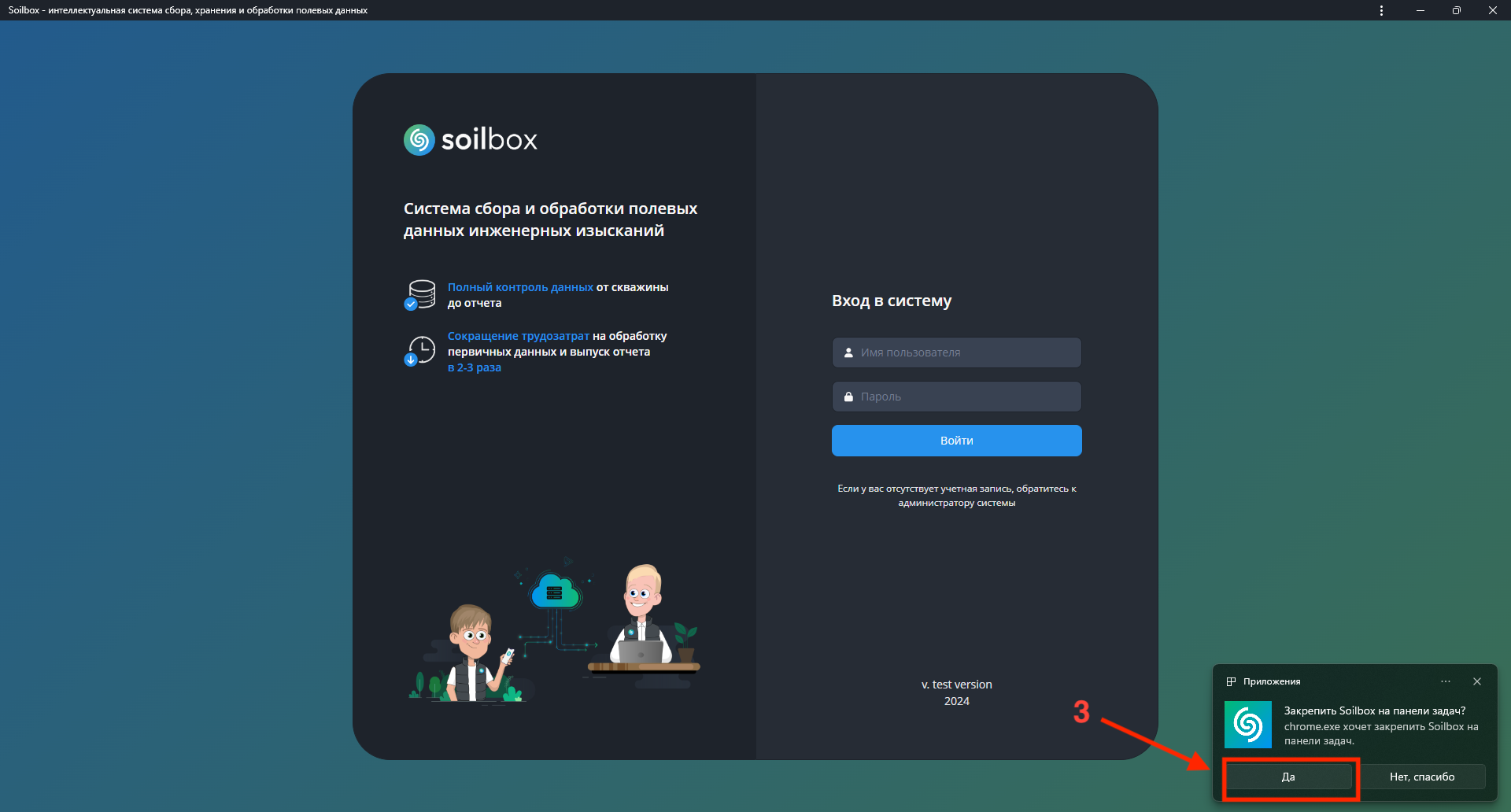 - Далее появится уведомление - "Закрепить Soilbox на панели задач?" Нажимаем "Да" (кнопка 3). Приложение закрепится на панели задач.