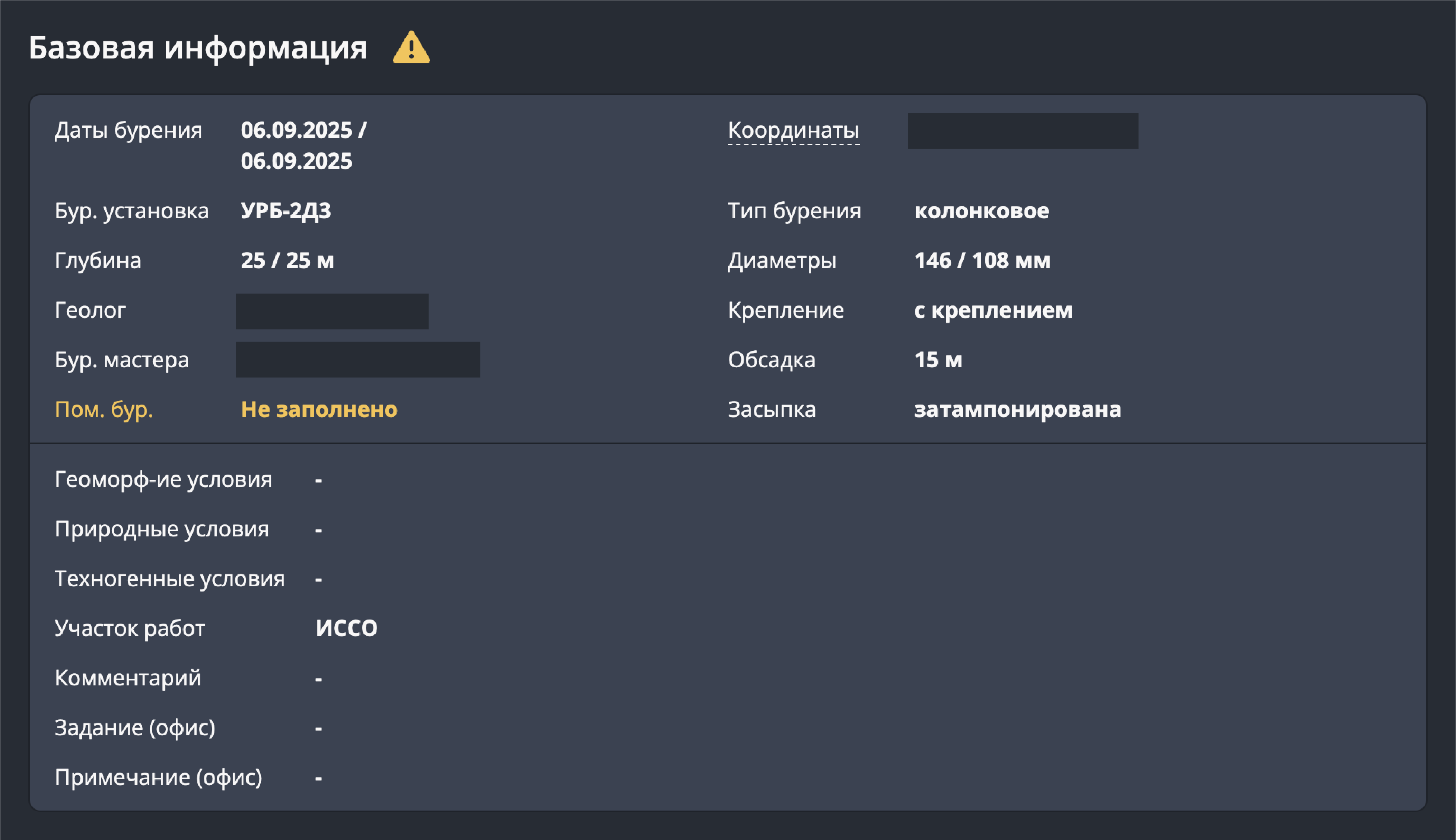 Если одно из ключевых полей не заполнено, карточка скважины получает предупреждение, а конкретные незаполненные поля выделяются жёлтым.
