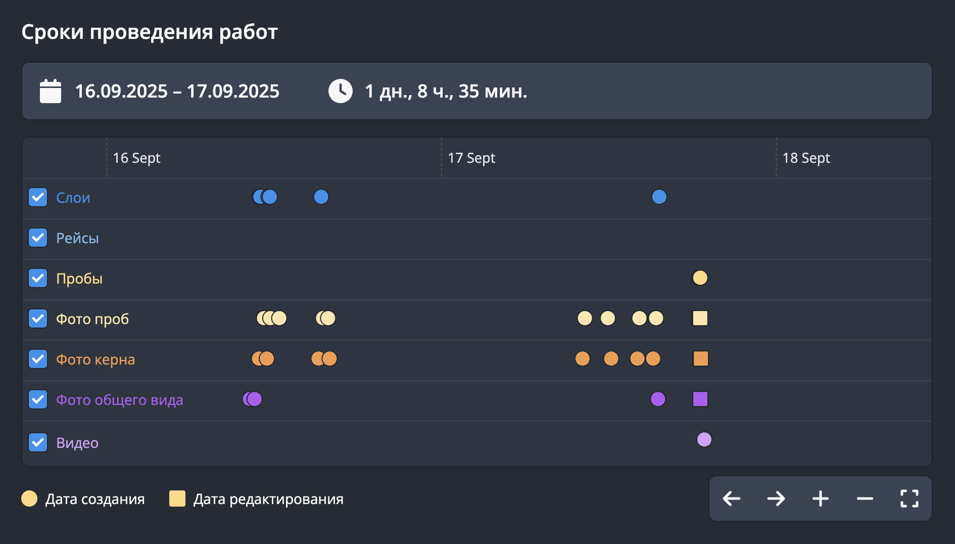 На временной шкале отображаются даты создания и редактирования слоёв, проб, рейсов, фотографий и видеоматериалов.