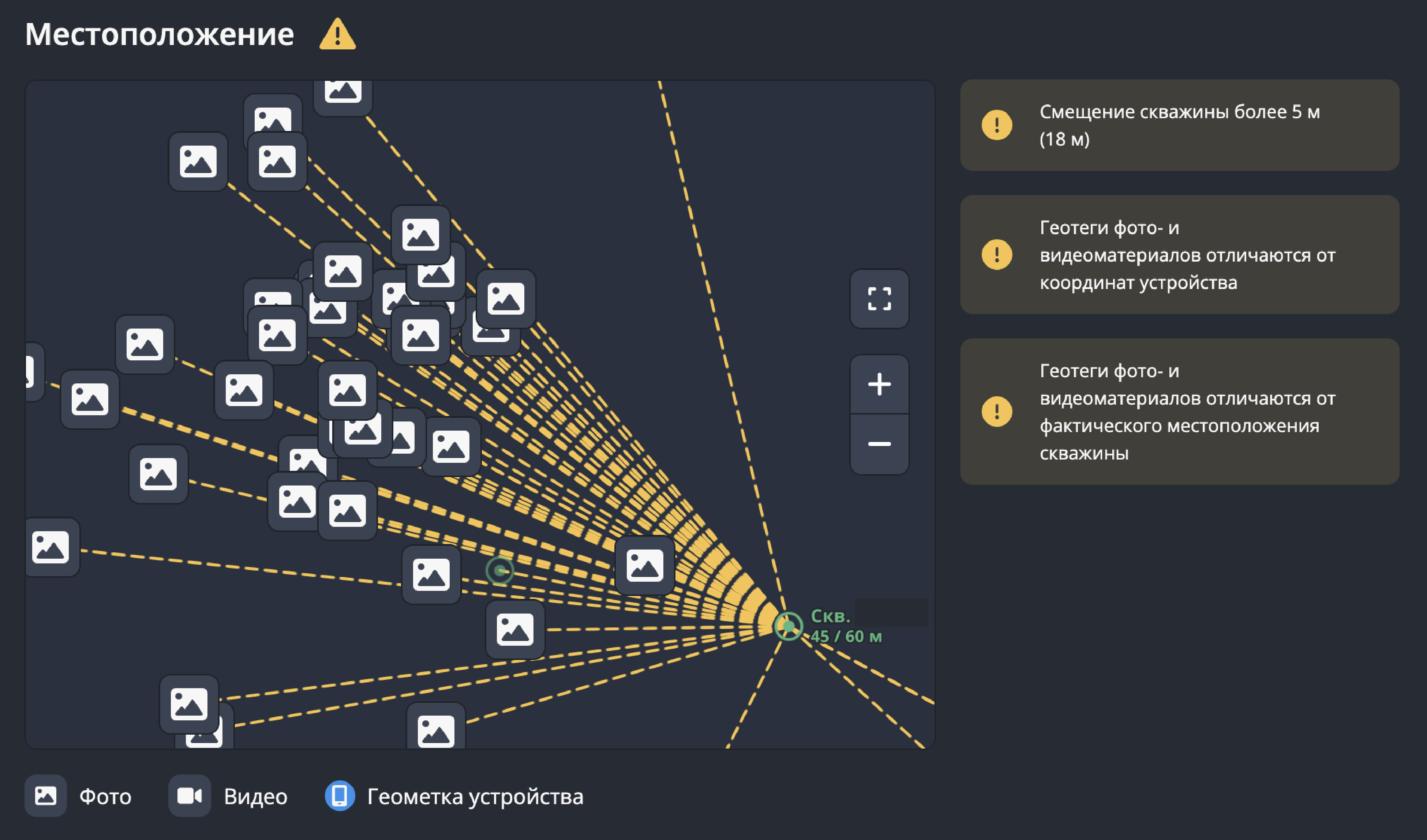 Во вкладке «Местоположение» отображается карта с фактическими координатами скважины и отметками геопозиций, взятых из фото- и видеоматериалов.