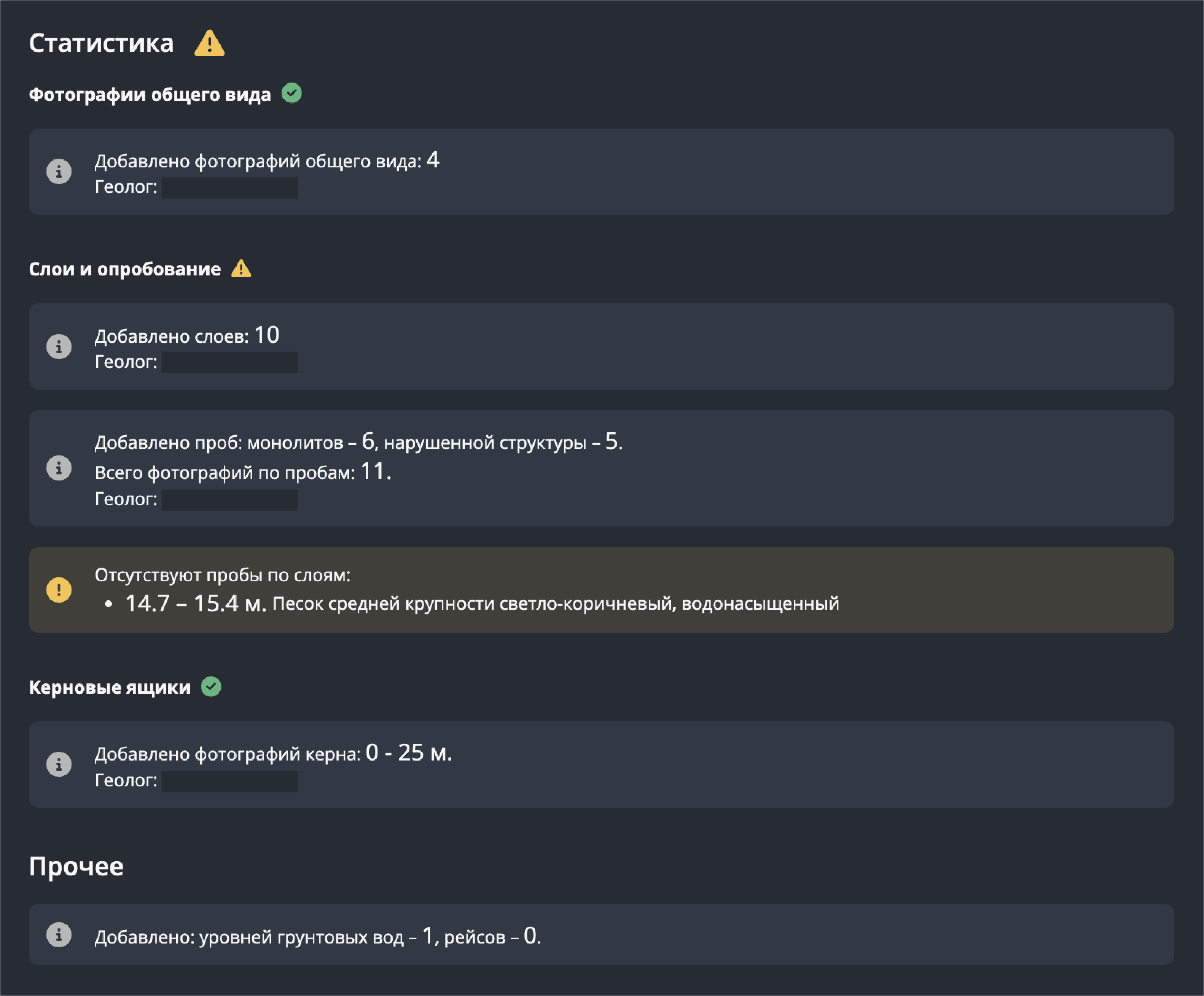 - Наличие УГВ и порейсового описания — анализируется, заполнены ли данные об уровне грунтовых вод и добавлены ли описания рейсов.